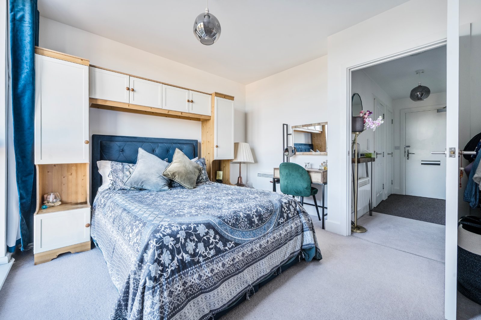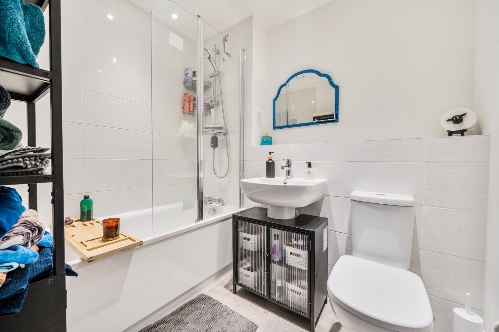 The generous double bedroom is filled with natural light from large windows and provides ample space for furniture and storage. A modern bathroom with full-sized bath and shower, WC, and wash basin is conveniently accessed from the hallway, alongside a useful storage cupboard.
