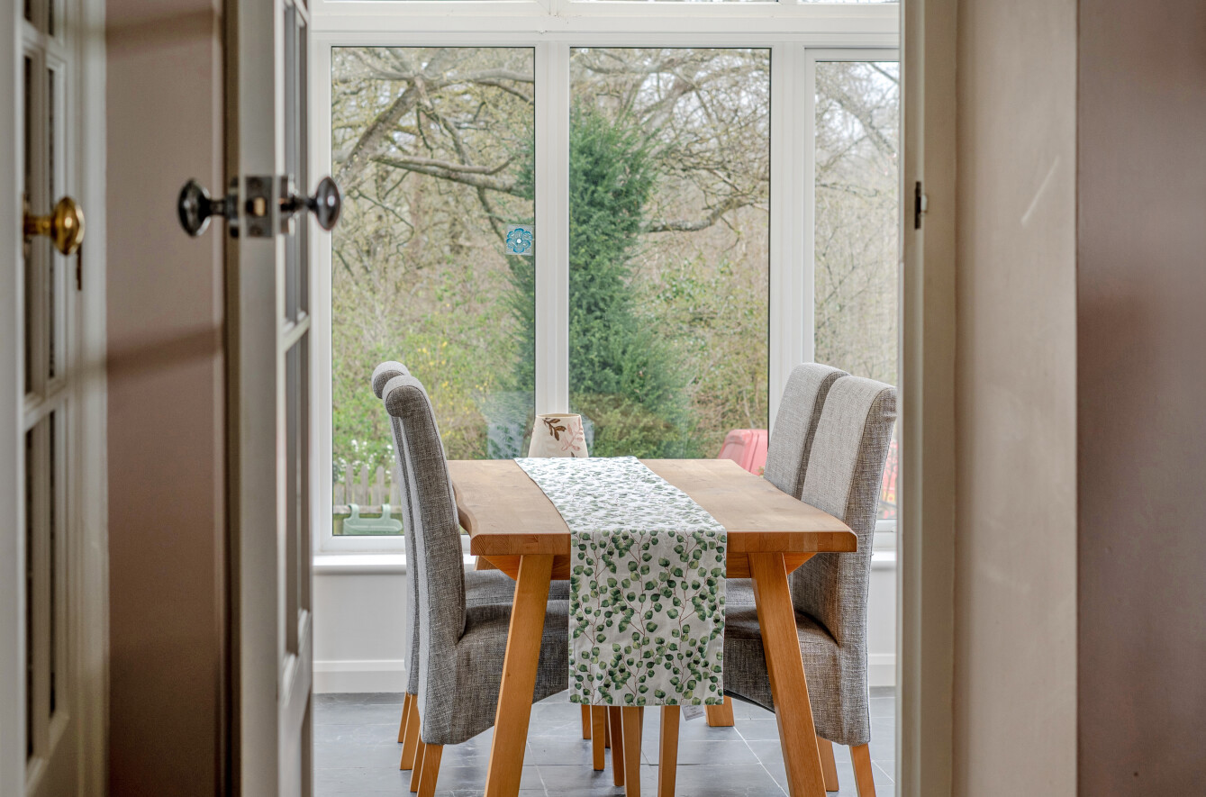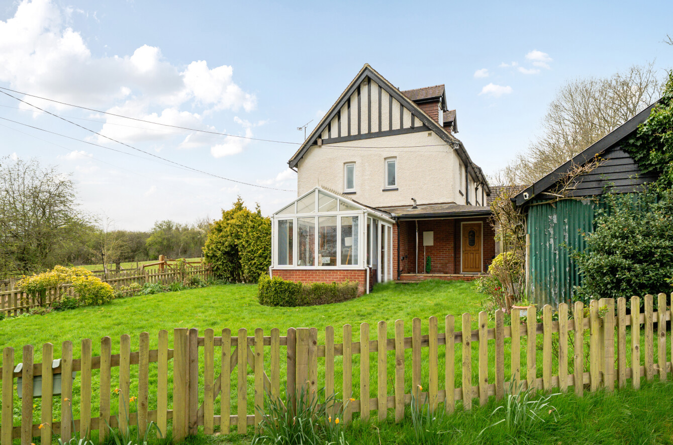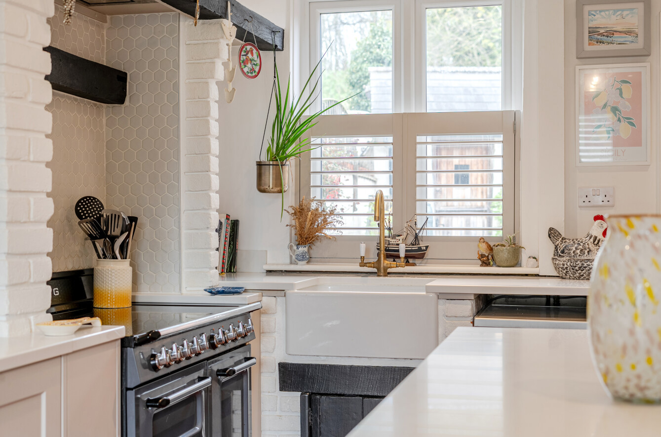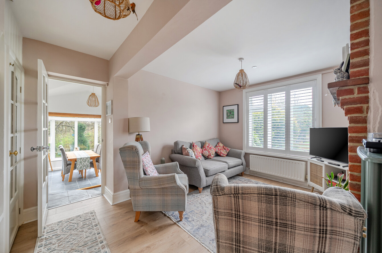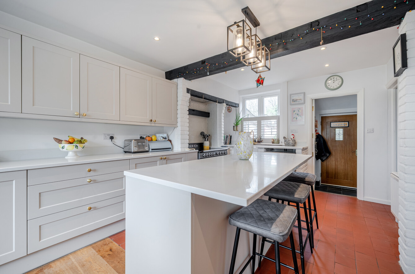 Inside, a welcoming entrance hall leads to a charming sitting room, complete with an exposed brick fireplace, timber mantel, oak-effect flooring, and shutters. At the heart of the home is a beautifully designed kitchen/dining room with a contemporary country feel, featuring soft cabinetry, white quartz worktops, terracotta flooring, exposed beams, and pendant lighting. A practical utility room further complements the kitchen and a guest cloakroom adds further convenience. Clever under-stairs storage and shelving add practical appeal. A bright conservatory extends the living space, offering a perfect dining or garden room with direct access to the terrace and rear garden.