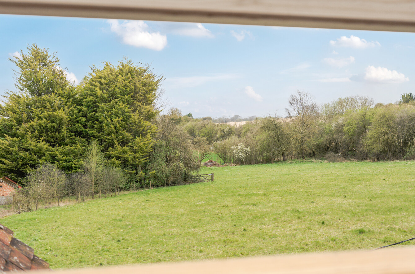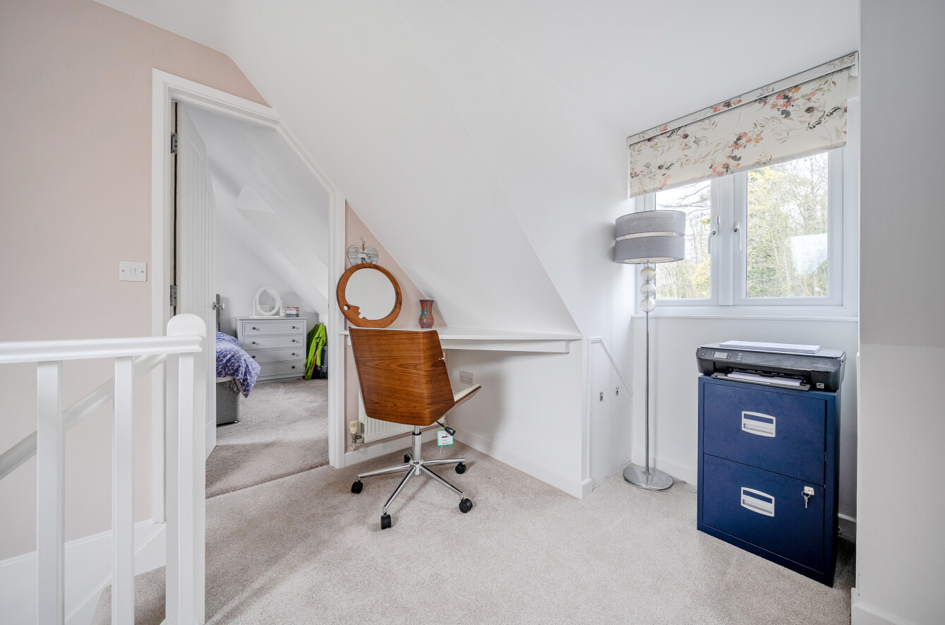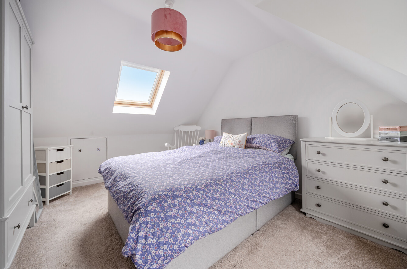 Upstairs, the bedroom two enjoys countryside views and a feature blue-tiled fireplace, alongside two further well-proportioned bedrooms and a stylish family bathroom with patterned flooring and a curved bath. The top floor loft conversion provides a spacious additional bedroom with en-suite shower room and dressing room with vaulted ceilings, Velux windows, and eaves storage.
