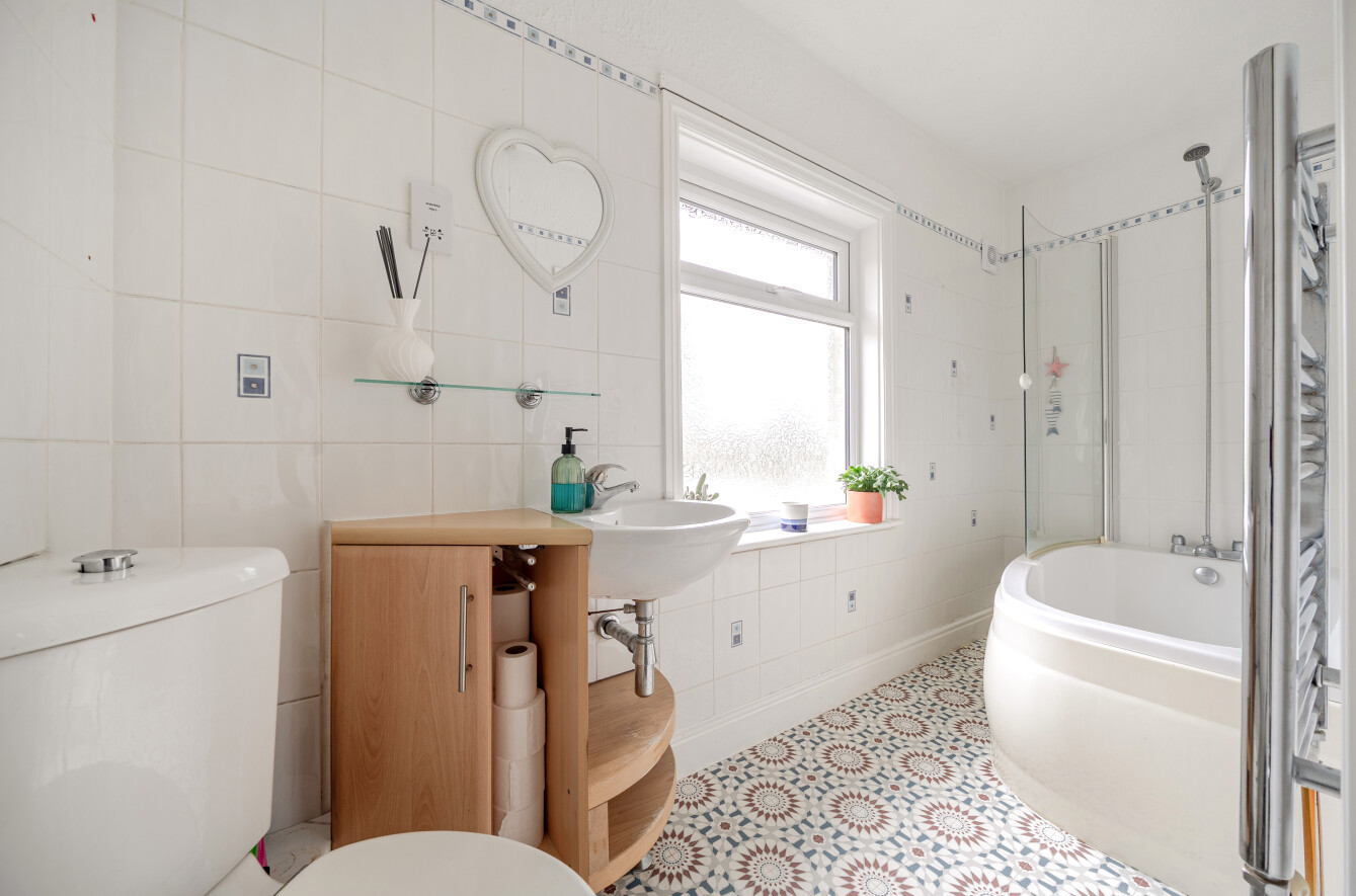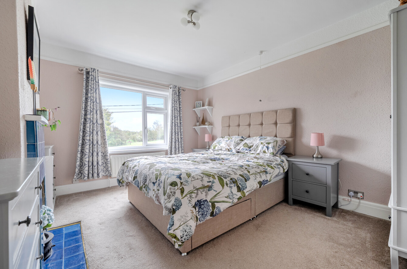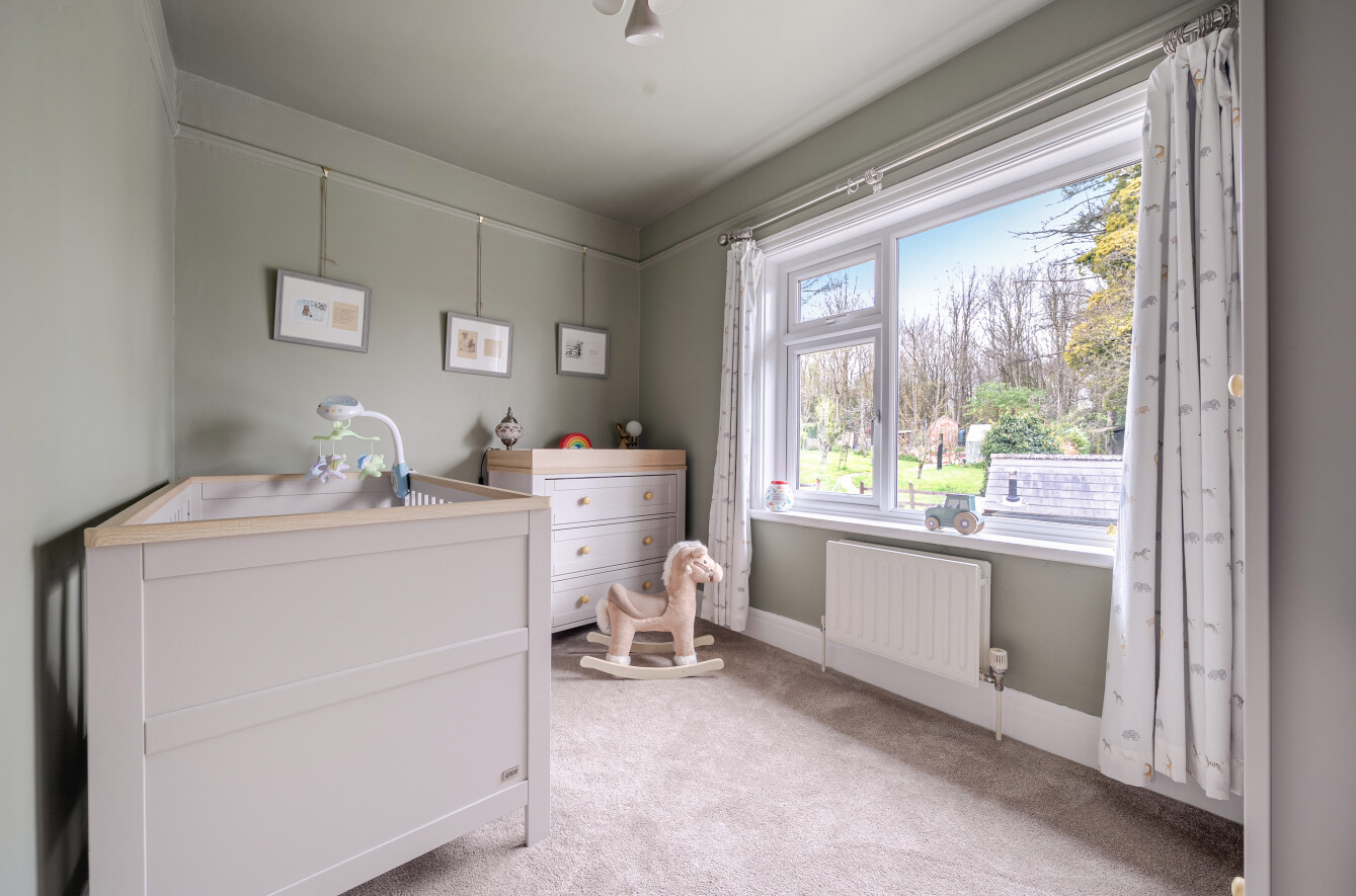 Upstairs, the bedroom two enjoys countryside views and a feature blue-tiled fireplace, alongside two further well-proportioned bedrooms and a stylish family bathroom with patterned flooring and a curved bath. The top floor loft conversion provides a spacious additional bedroom with en-suite shower room and dressing room with vaulted ceilings, Velux windows, and eaves storage.