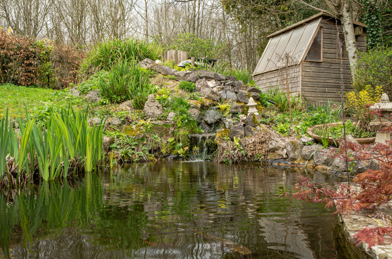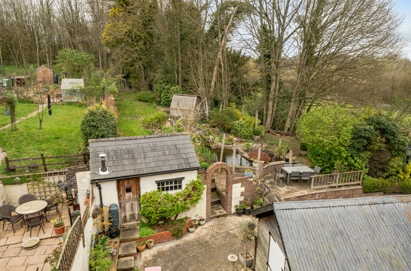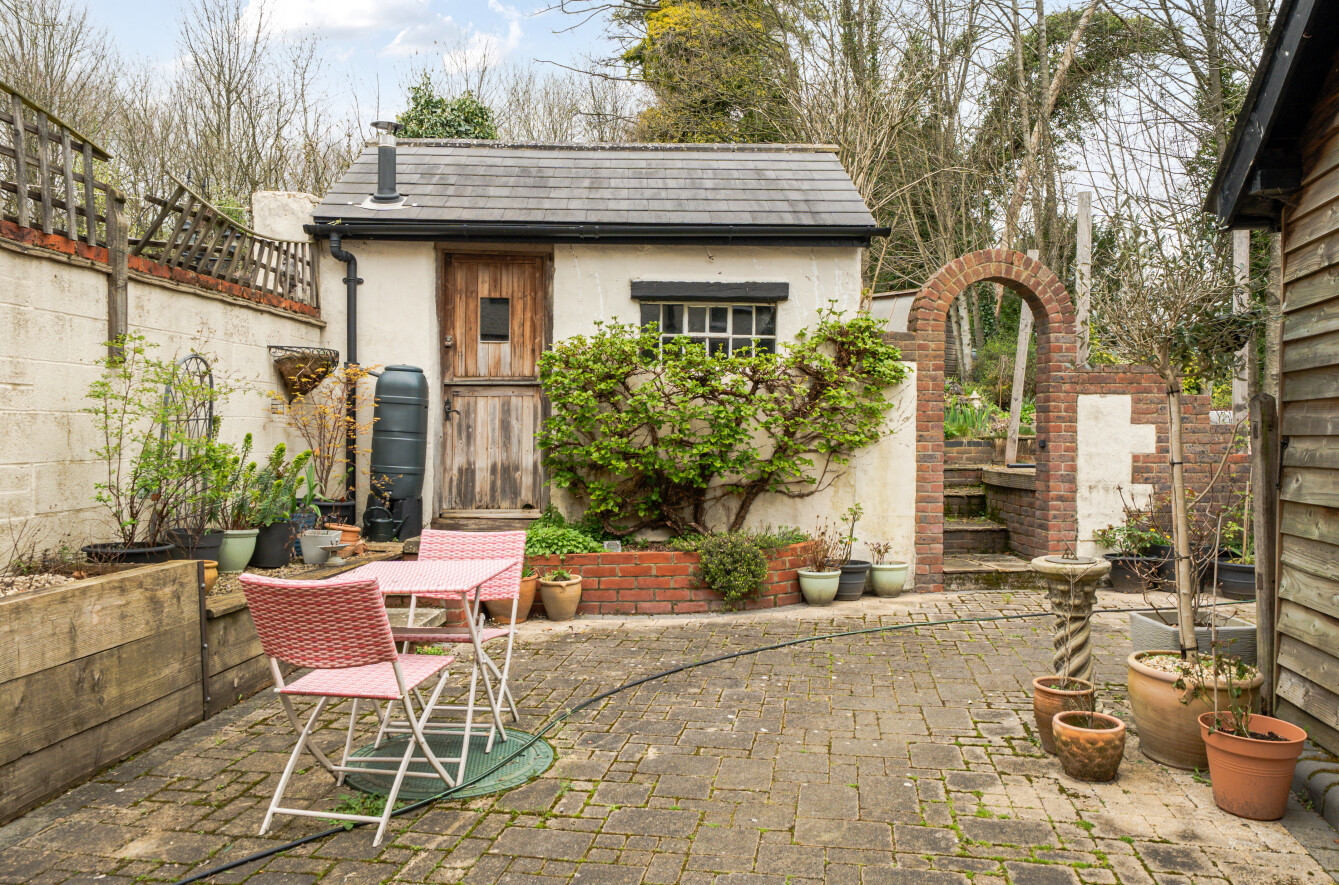 Additional features include a beautifully landscaped tiered garden with mature planting, climbing shrubs, and a generous patio ideal for outdoor dining. Three timber outbuildings offer excellent versatility for storage, hobbies, or workshop use, while a picket fence and gravel driveway complete the setting.