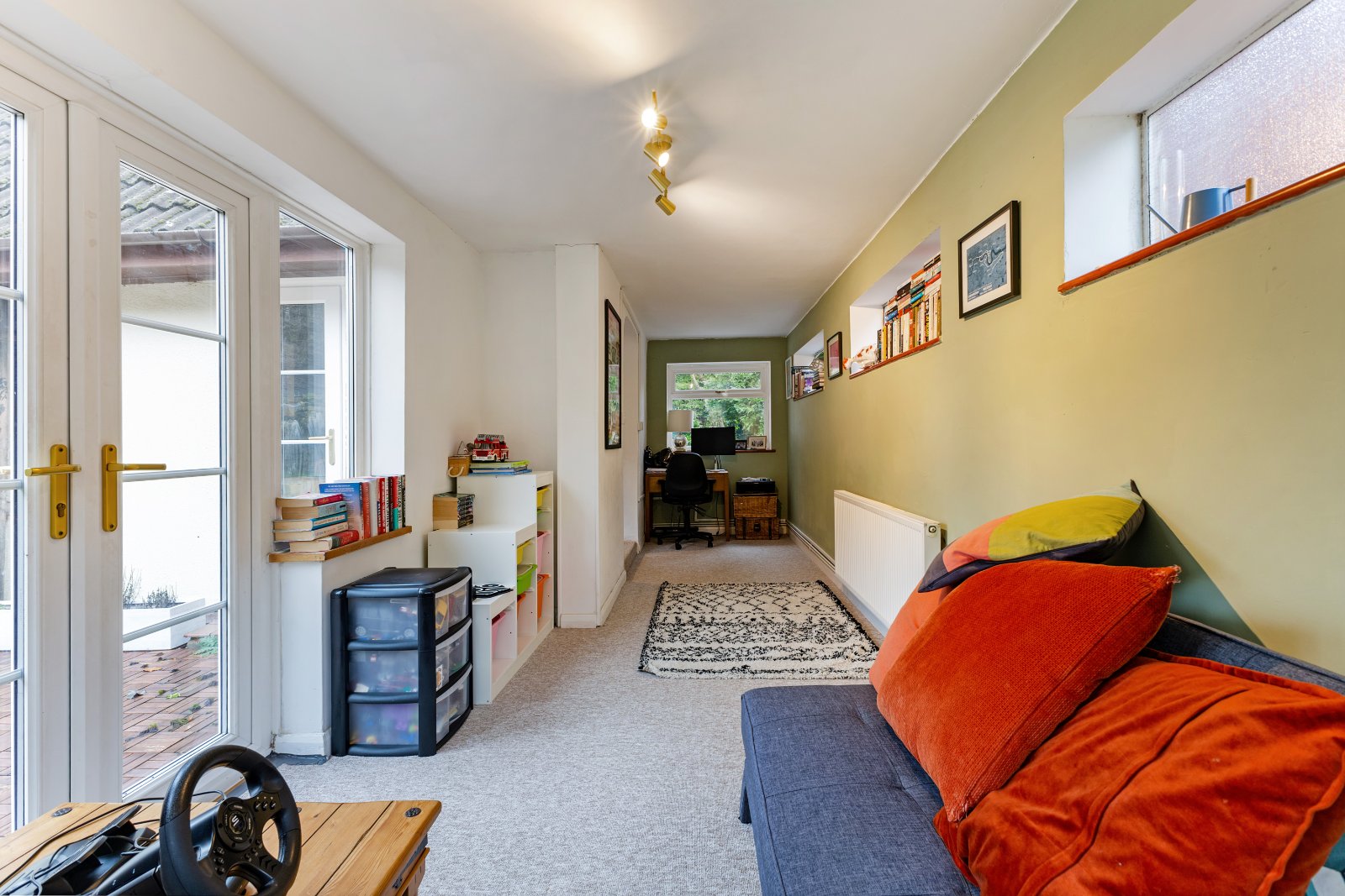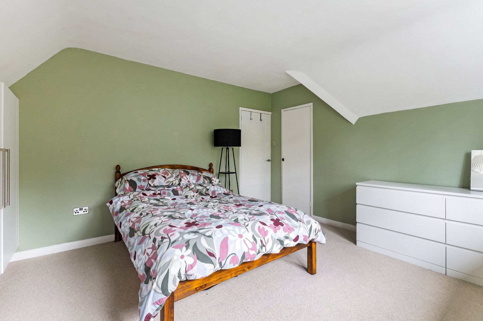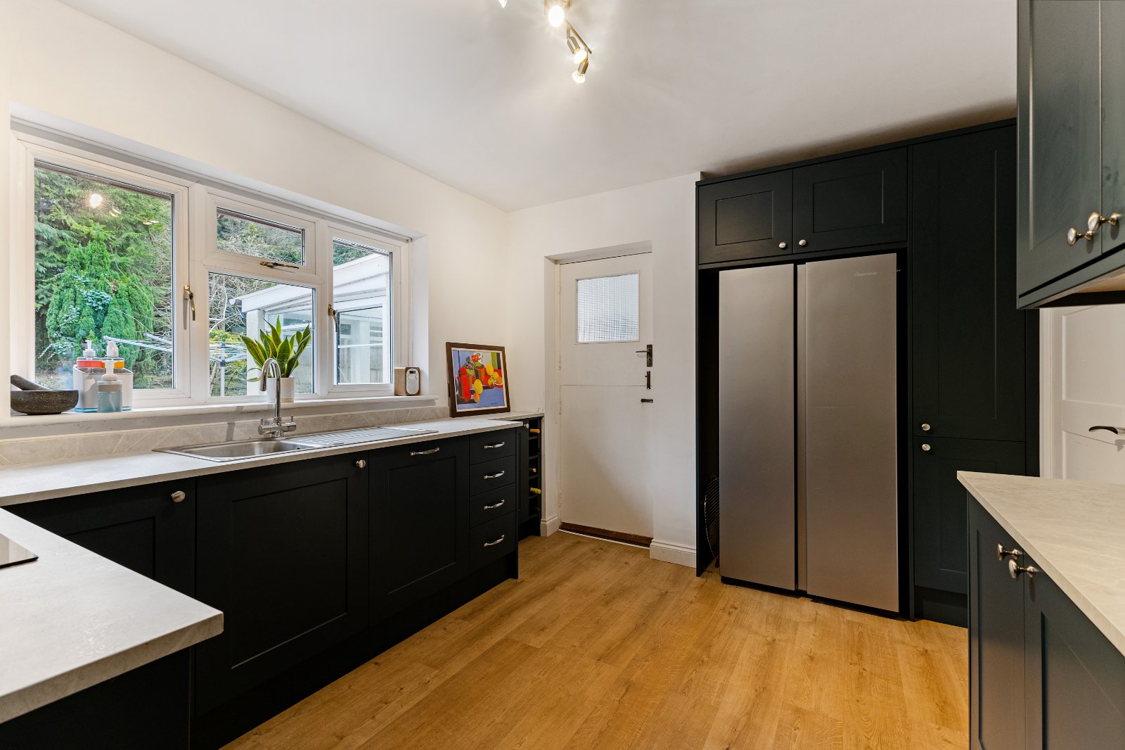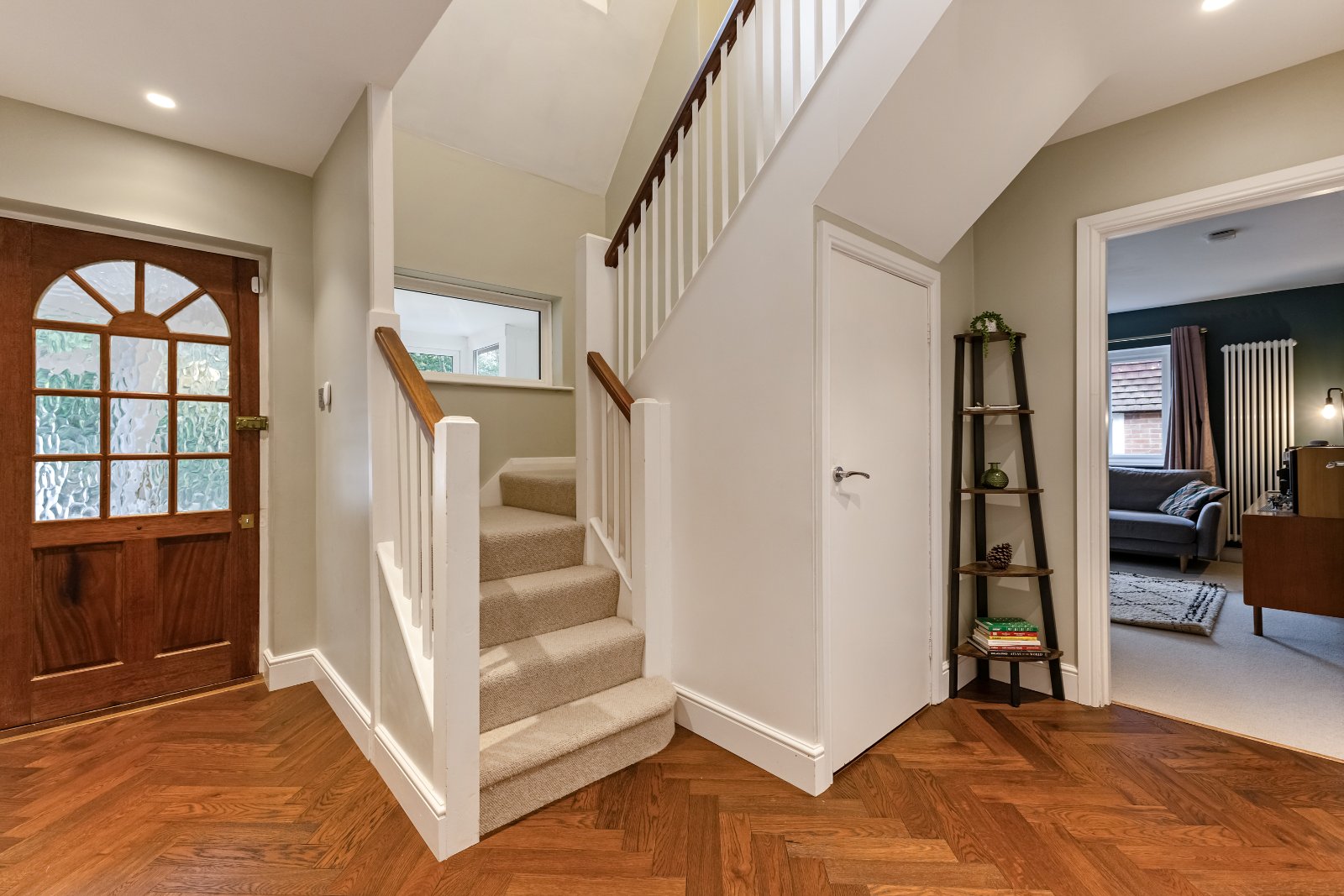 At the heart of the home sits a modern kitchen with quality appliances, excellent storage and an adjoining breakfast room that looks out onto the south-facing garden — an ideal spot for morning coffee or family mealtimes. A versatile family room offers extra space that works perfectly as a playroom, snug or home office, while the spacious sunroom, currently used as a gym and garden room, adds even more flexibility. Additional storage and a convenient downstairs cloakroom complete the ground floor. Upstairs, the home continues to feel bright and airy, with four comfortable bedrooms. The primary bedroom enjoys calming views of the front garden and mature trees, complemented by tasteful décor and ample built-in storage. The remaining bedrooms are generously sized and share a stylish family bathroom featuring both a bath and separate shower.