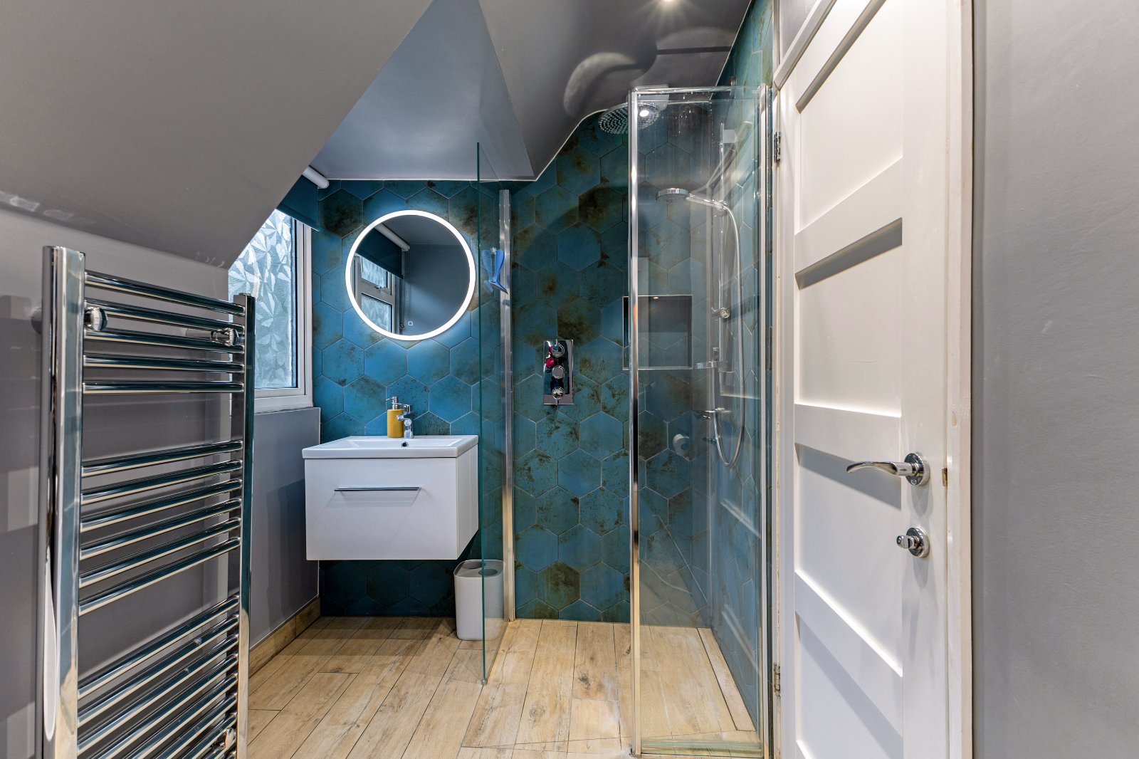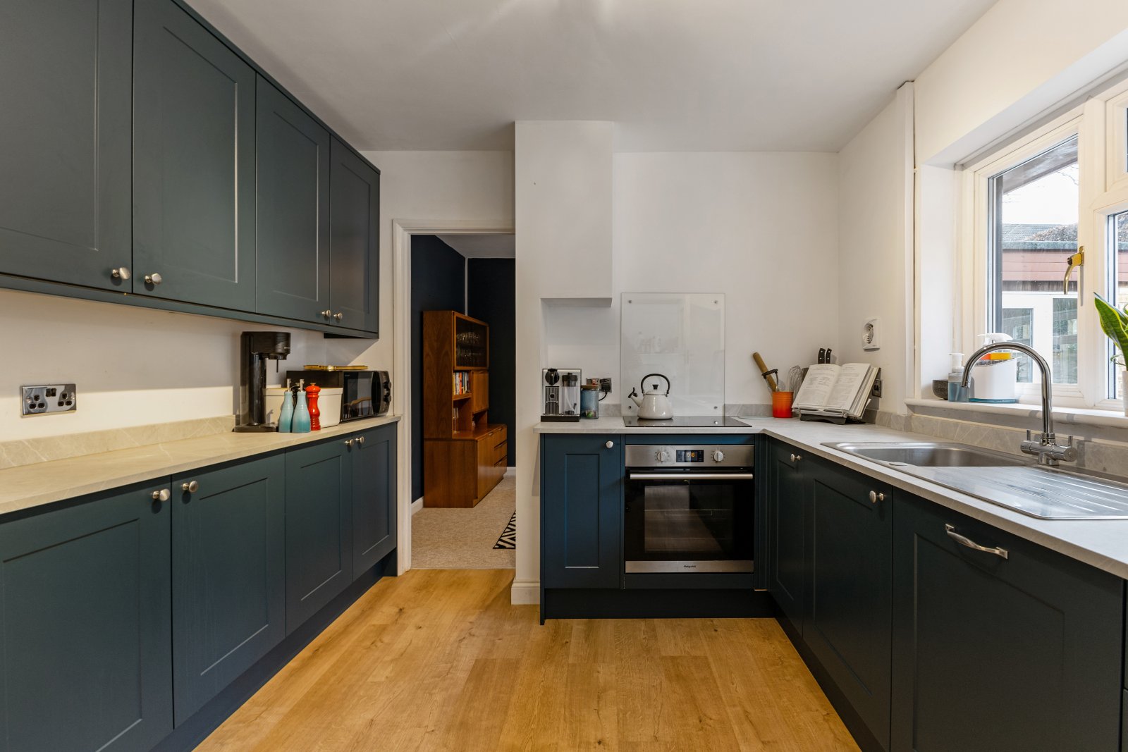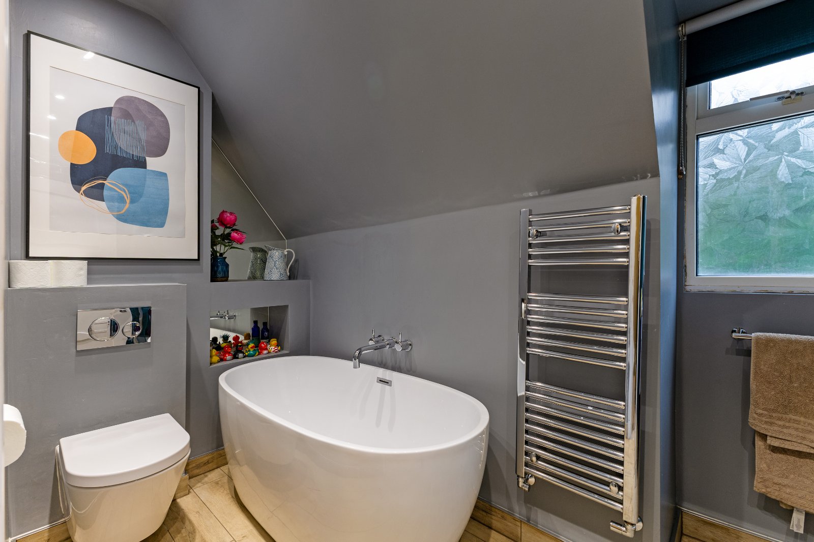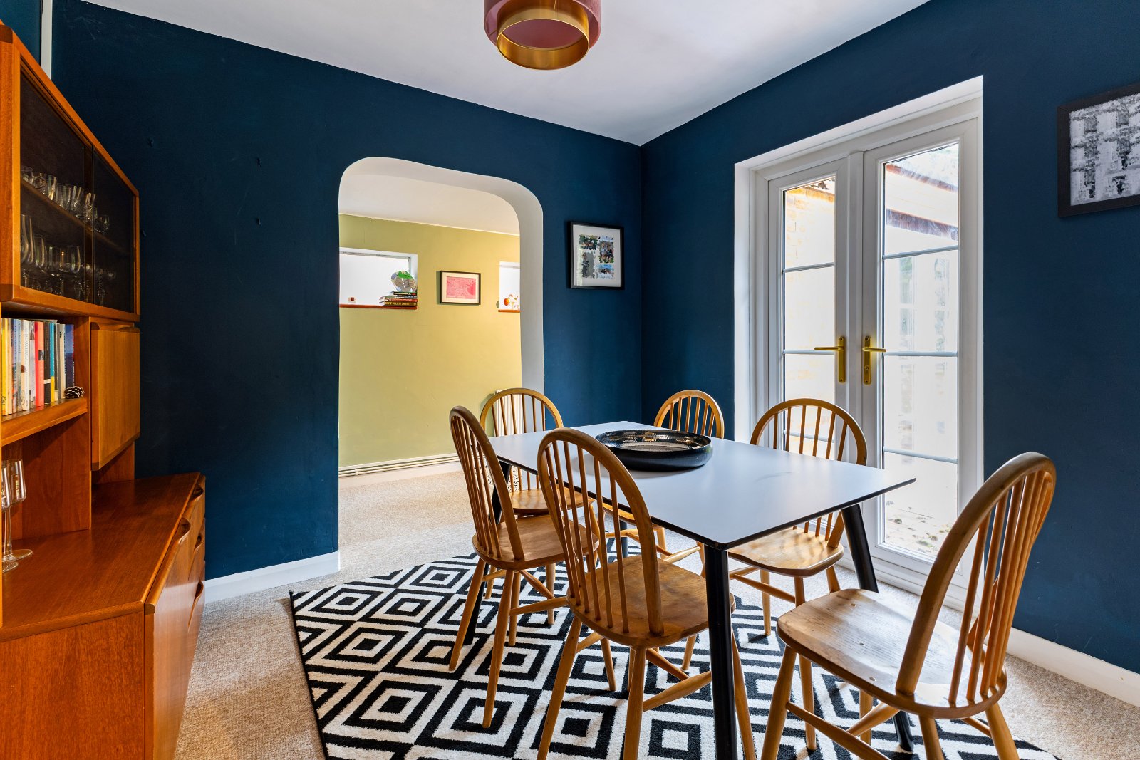 The south-facing garden is a real highlight — private, sunny and mostly laid to lawn, with a paved terrace ideal for summer gatherings or relaxed evenings outdoors. Mature planting attracts birds and wildlife, creating a peaceful, green backdrop. A set of steps leads to a raised area, offering potential for an extra seating spot to catch the last of the evening sun or space for a garden shed.