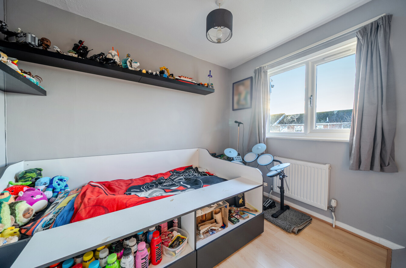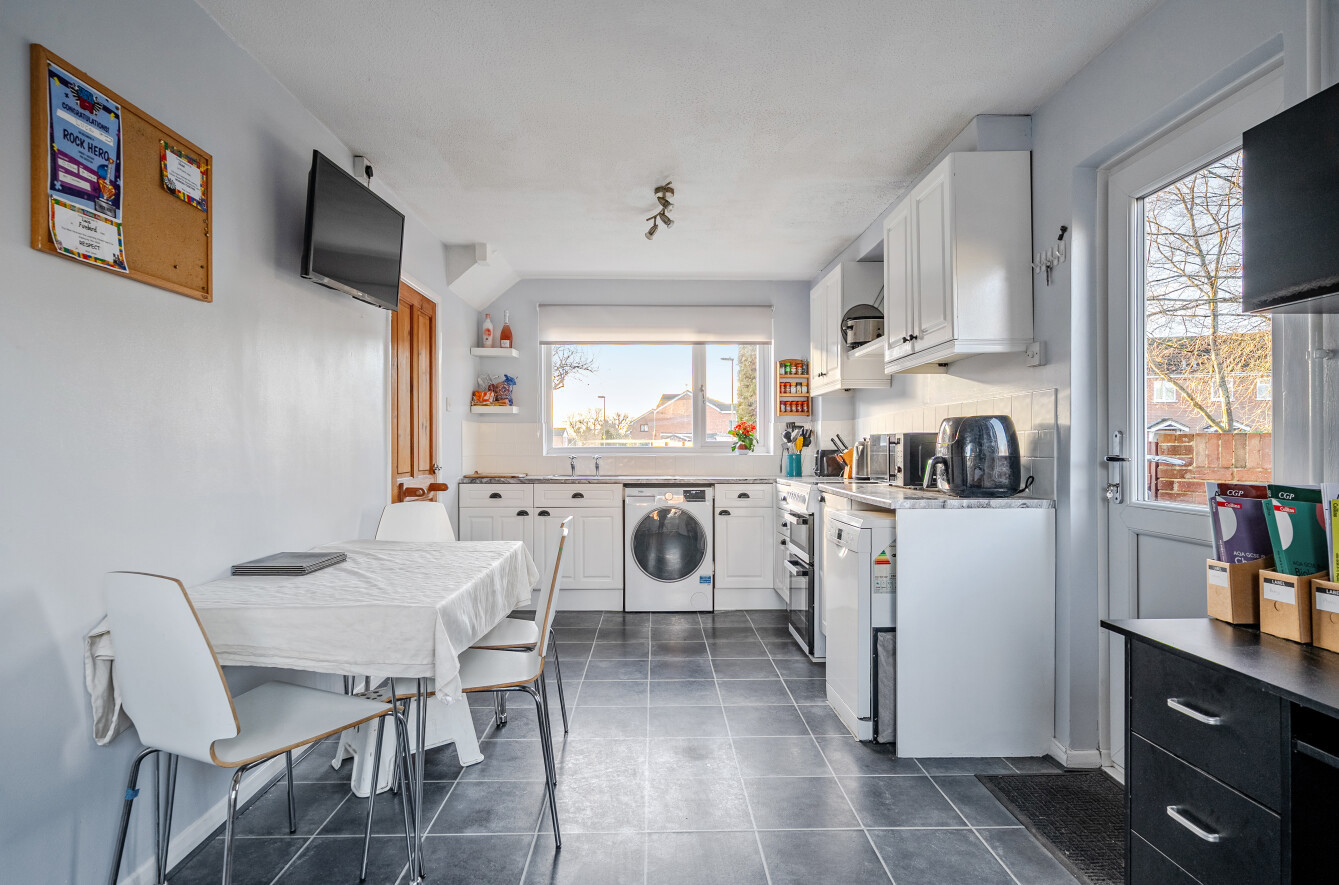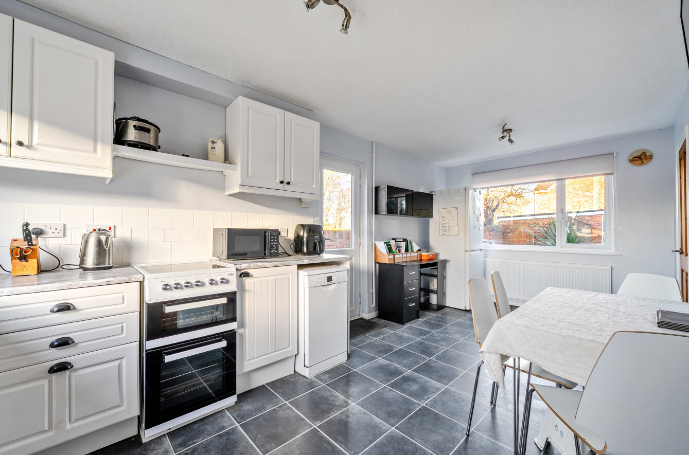 Occupying an end-of-terrace position within a small and quiet development, the home benefits from a generous rear garden and direct internal access to a single garage, adding both practicality and appeal. The ground floor is thoughtfully arranged, featuring a spacious open-plan kitchen/dining area that can be accessed from both the hallway and the lounge, creating a natural flow for modern living and entertaining. The bright and welcoming lounge boasts a feature fireplace and opens directly onto the rear garden through French doors, seamlessly connecting indoor and outdoor spaces.