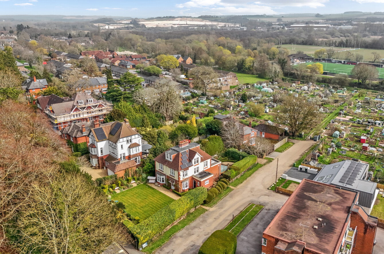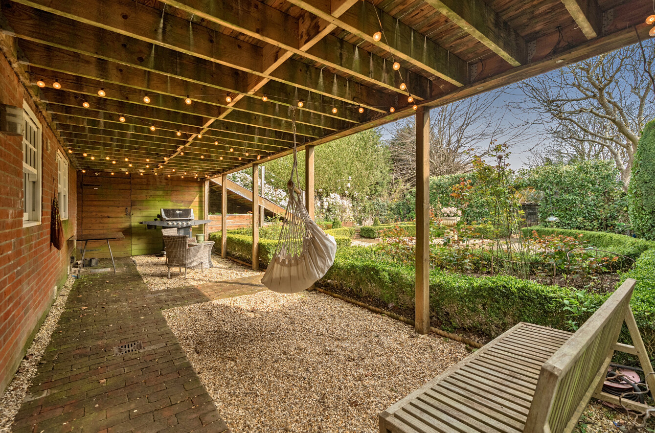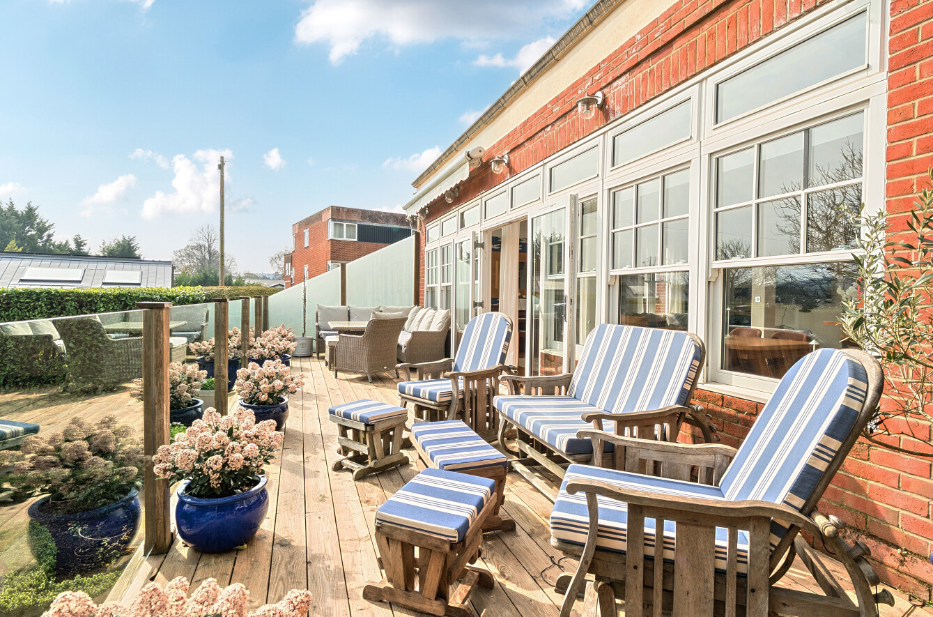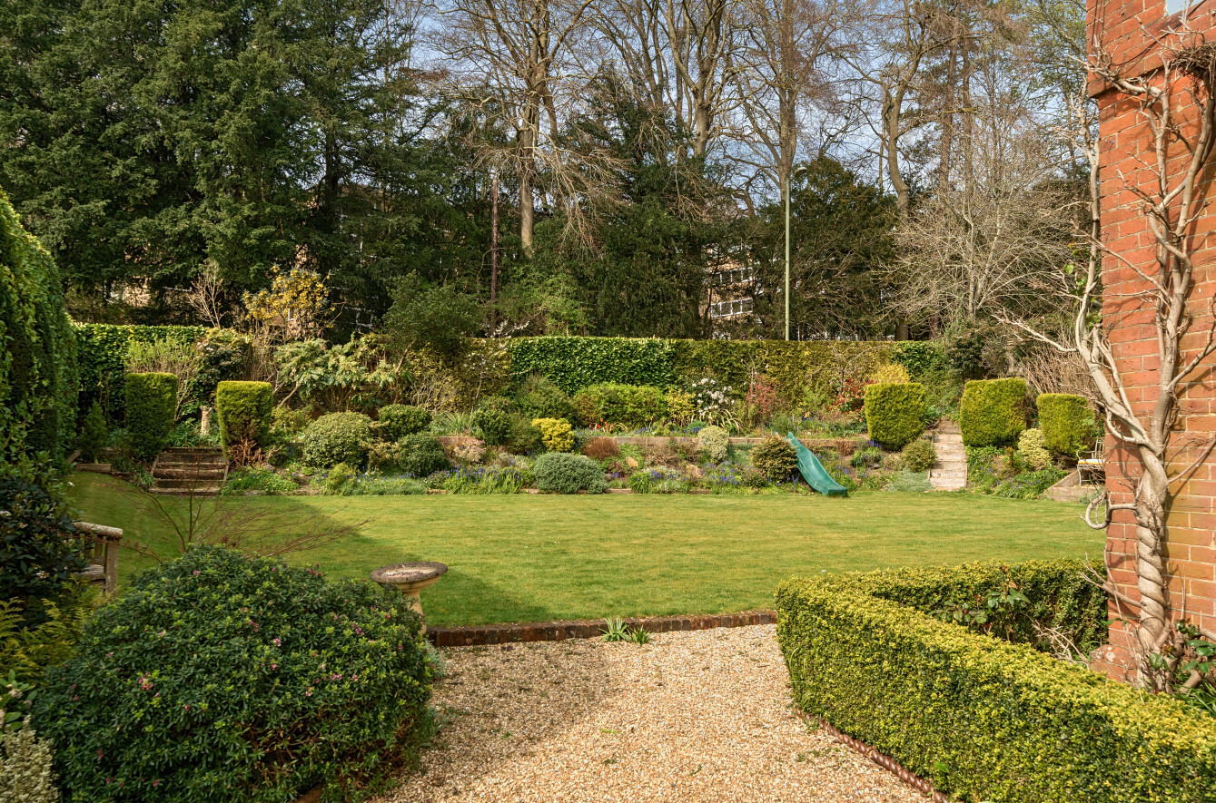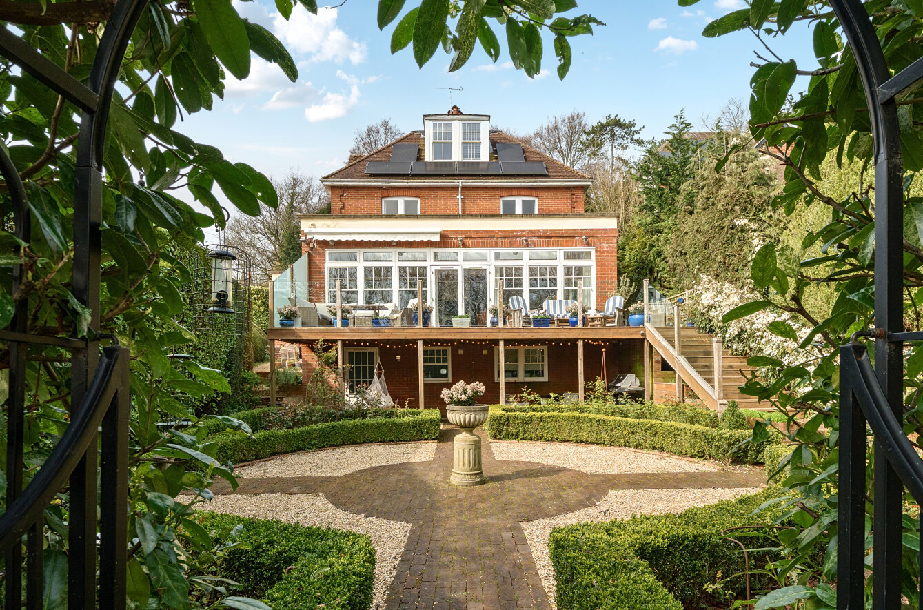 The property sits within a generous, private plot. To the front, lawns are framed by mature hedging and well-planted borders. The rear garden is beautifully landscaped in a formal parterre style, featuring box hedging, gravel beds, and brick pathways, all designed for low-maintenance elegance. A large decked terrace with a glazed balustrade provides the perfect spot for outdoor dining and entertaining. A further detached garage is accessed via Edington Road.