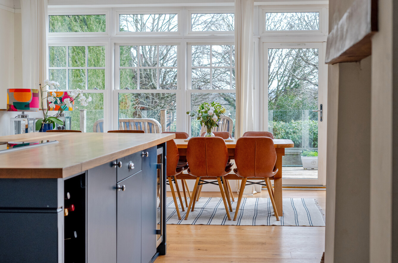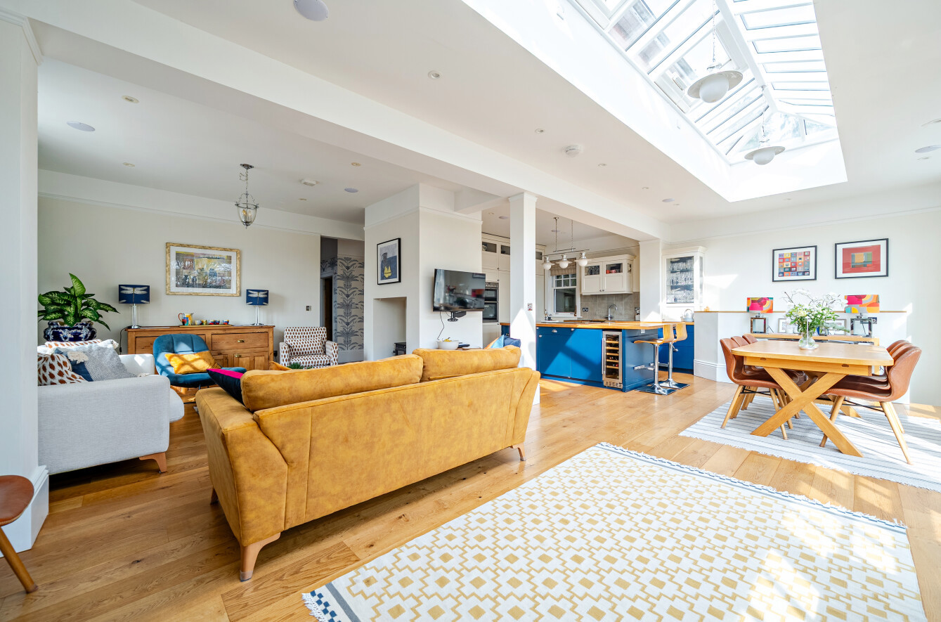 Two elegant reception rooms sit off the hallway - a spacious drawing room and a stylish sitting room - both offering classic proportions and plenty of character. The drawing room features a striking fireplace, exposed timber flooring, and a large bay window overlooking the front garden. The sitting room is equally inviting, complete with a feature fireplace, wood burner, and double doors opening directly onto the garden, creating a perfect space to relax or entertain. A walk-in pantry is also accessed from the hall.