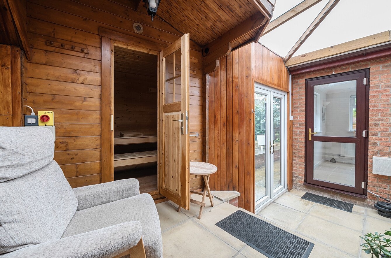 A flexible room downstairs was previously used as a large double bedroom. The kitchen is located to the front of the home and includes a range of wall and floor based units. A utility room can be found in the extended part of the home, together with a fully functional sauna room. The ground floor has the beneift of a guest cloakroom.