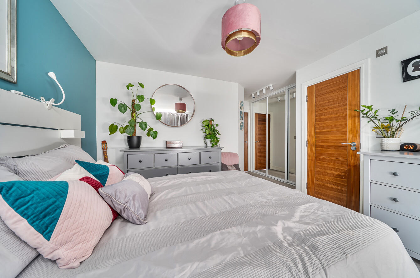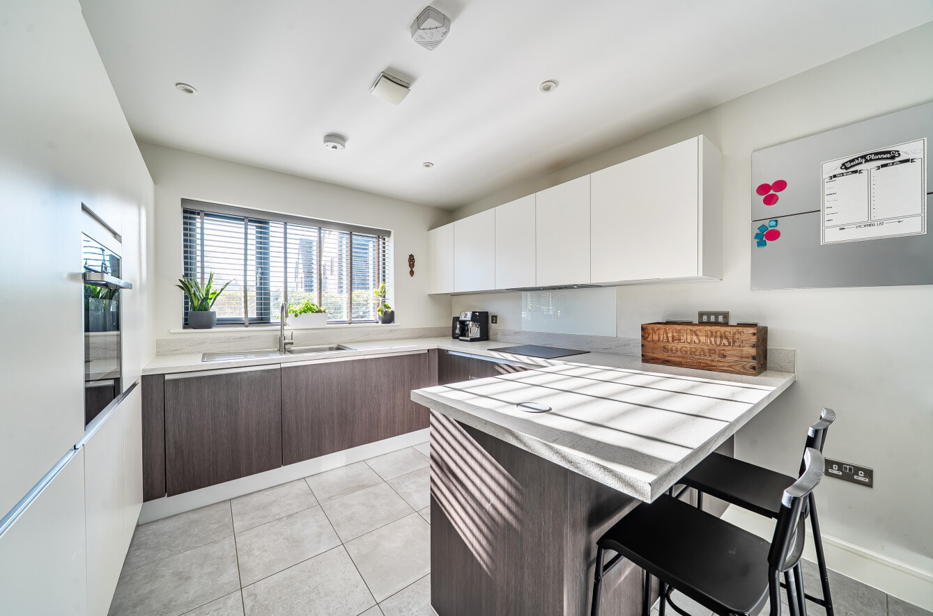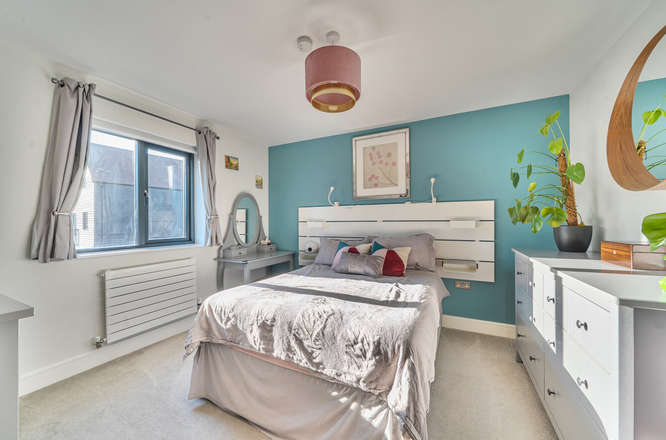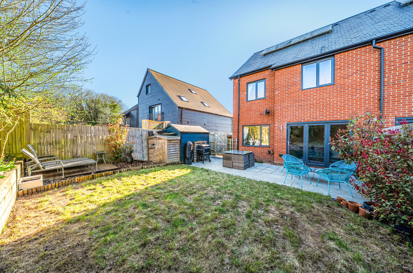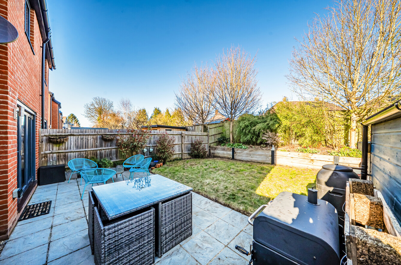 Externally, the rear garden has been thoughtfully landscaped, featuring attractive planted borders and an extended patio area ideal for outdoor dining and relaxation. The property further benefits from a large private driveway providing off-road parking for multiple vehicles, as well as additional visitor parking within the development.