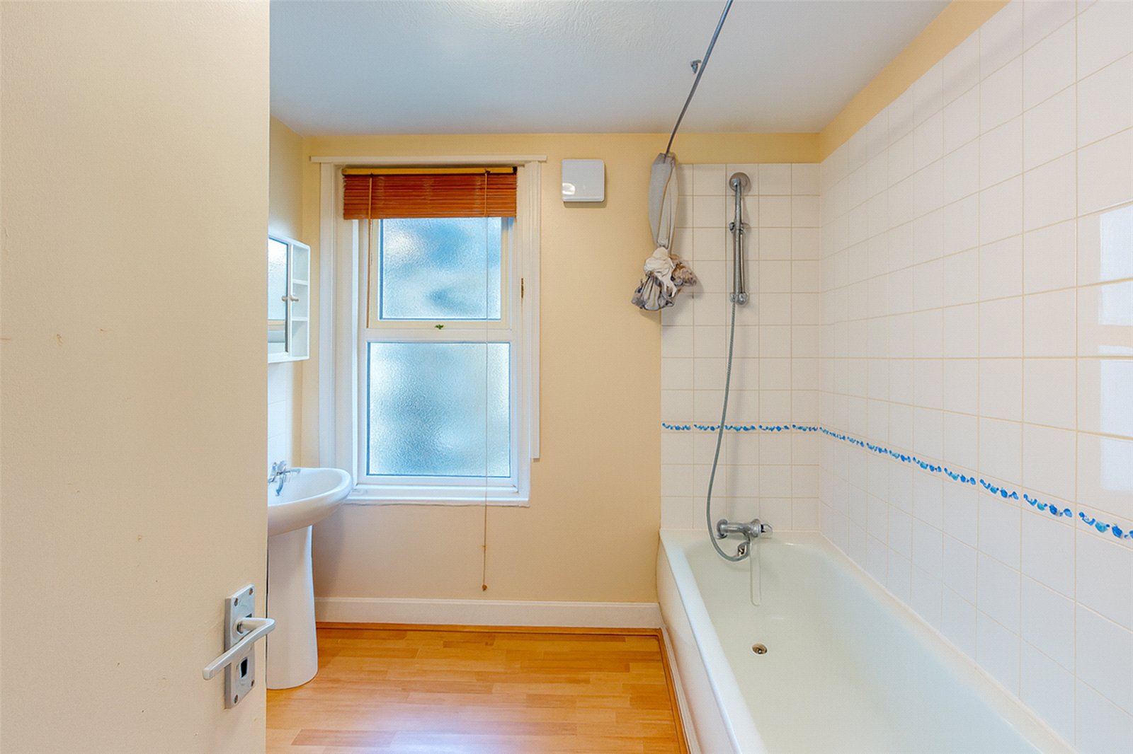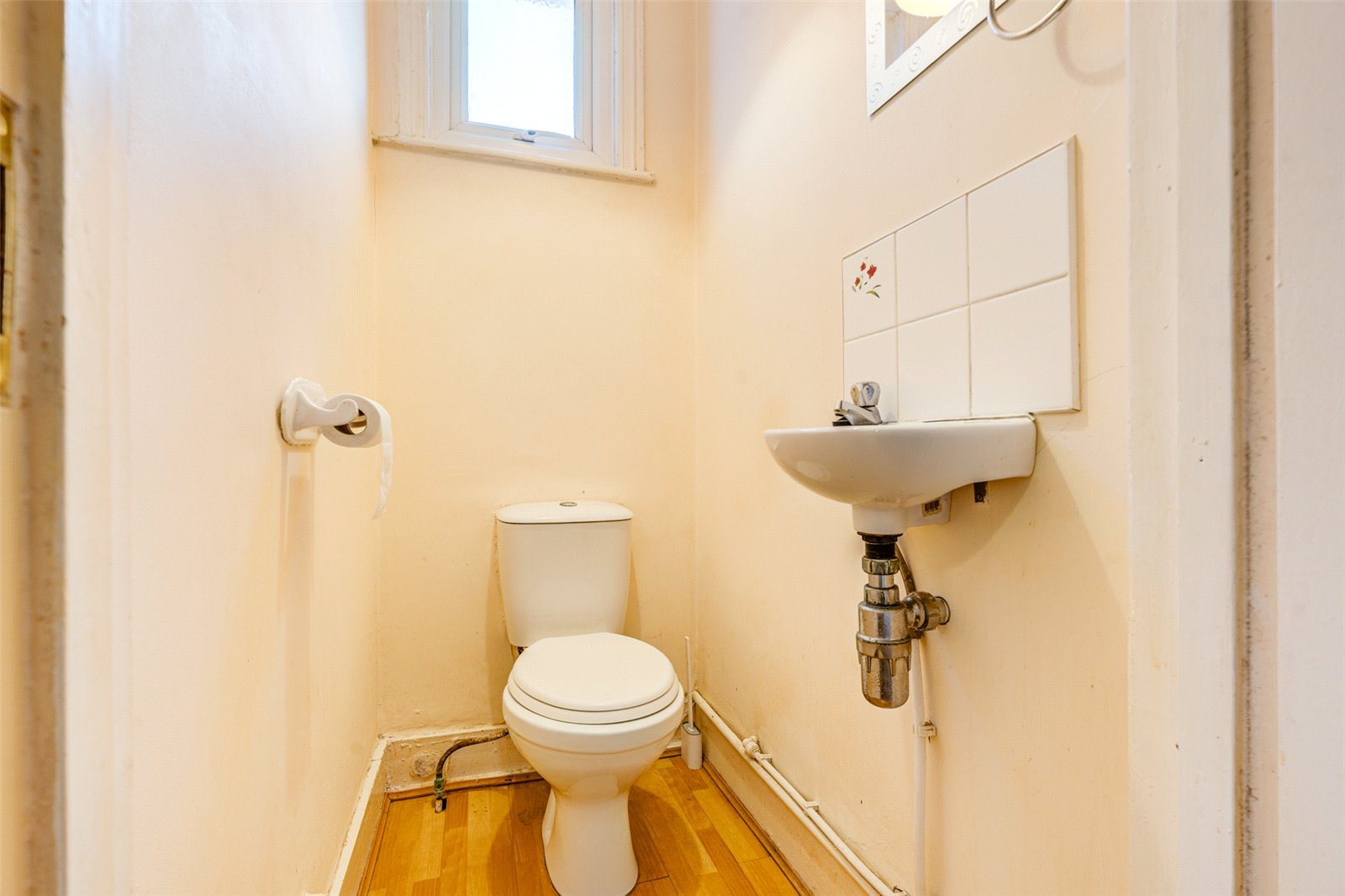 The fitted bathroom includes a bath with an overhead shower, a wash basin, and a useful storage cupboard. A separate WC is conveniently located adjacent to the bathroom.