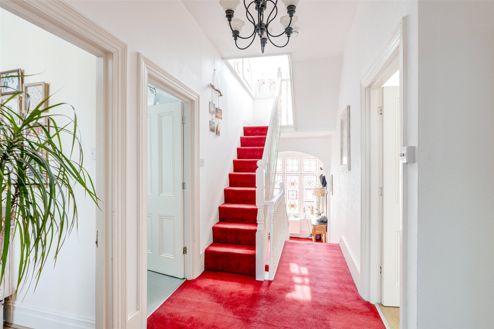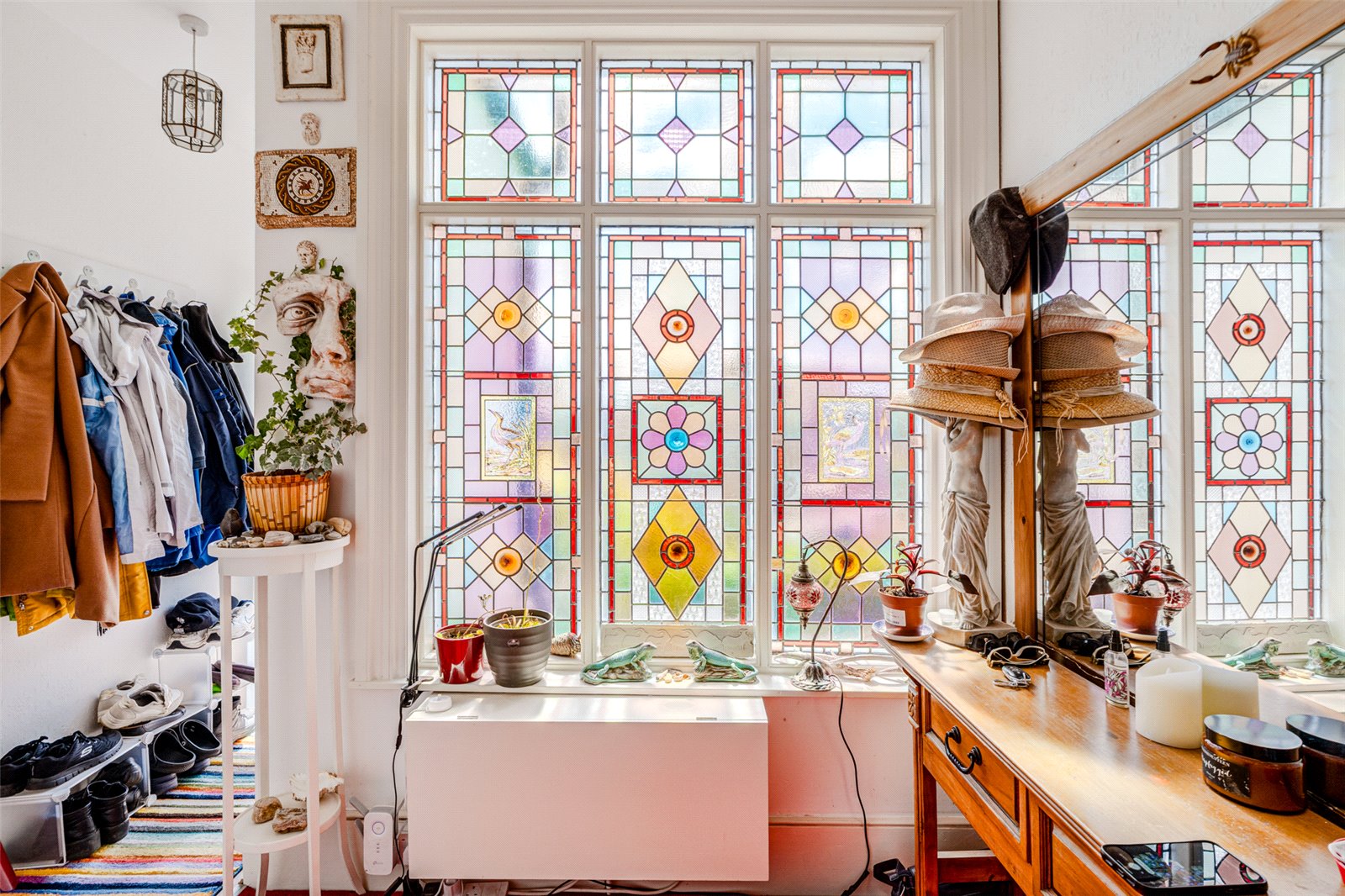 Upon entry, a private ground floor entrance featuring a door code entry system leads to a welcoming hallway and staircase ascending to the first floor. The spacious landing features original stained-glass windows and provides practical storage solutions for coats and belongings, along with plenty of storage featured in the understair's storage cupboards on the first and second floor.