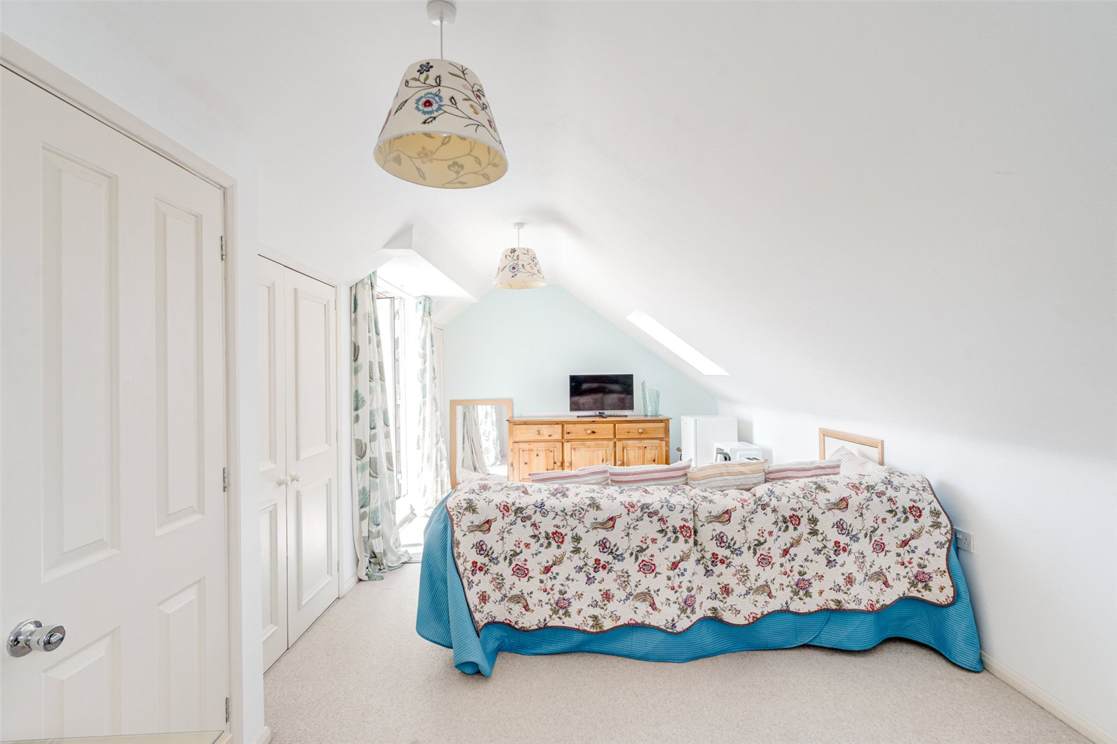On the upper floor, the master bedroom is a standout feature, with dual skylight windows and French doors opening onto the private south-facing balcony. The bedroom includes built-in wardrobes and offers plenty of room for bedroom furniture. Adjacent is a contemporary shower room with a walk-in shower, integrated vanity unit with wash basin, and WC.