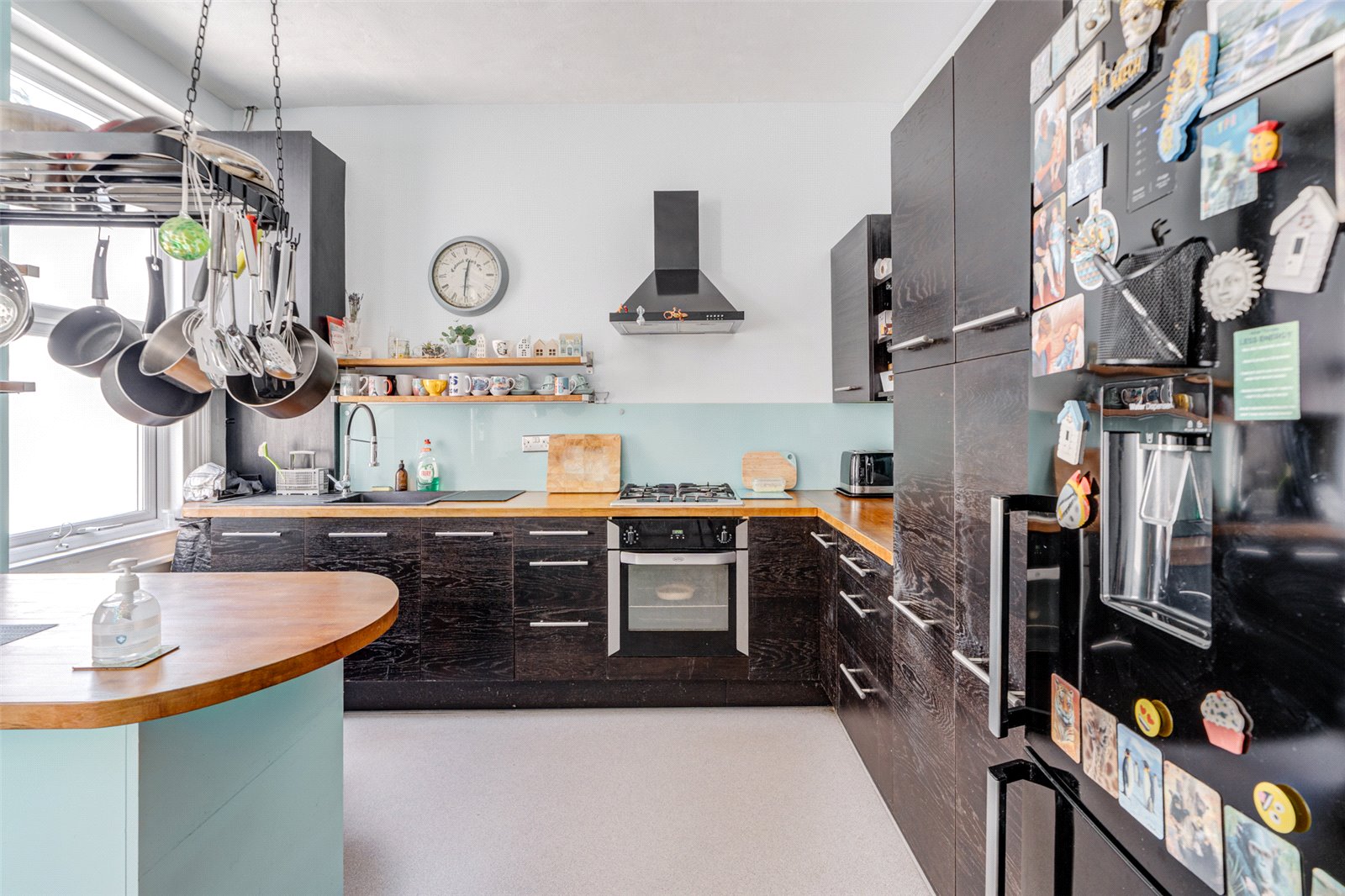 The adjacent kitchen is thoughtfully designed with sleek black wall and base units, complemented by wooden worktops. Integrated appliances and a built-in breakfast bar adding functionality and style. The kitchen offers plenty of room for additional dining and benefits from plentiful storage throughout.