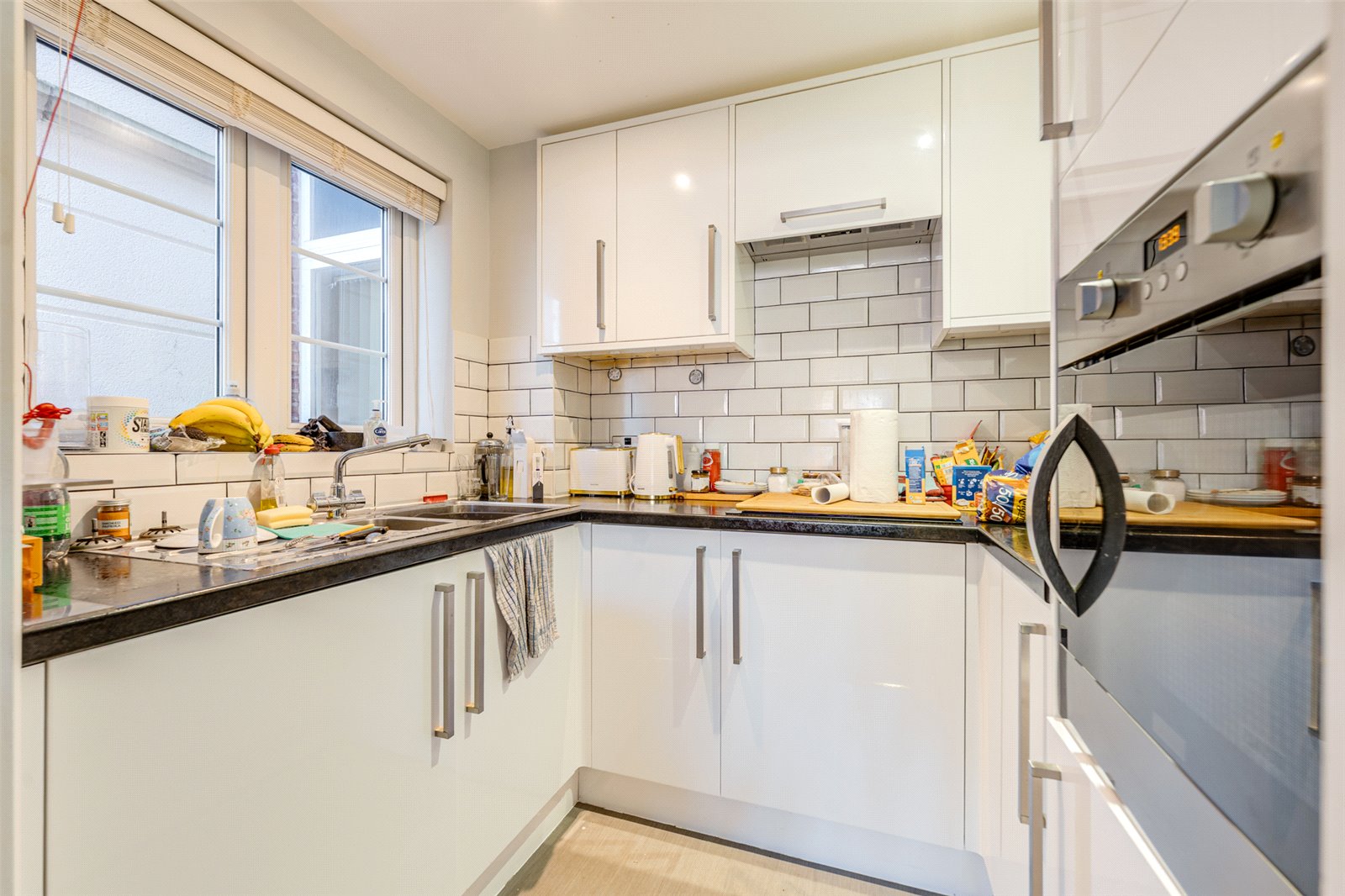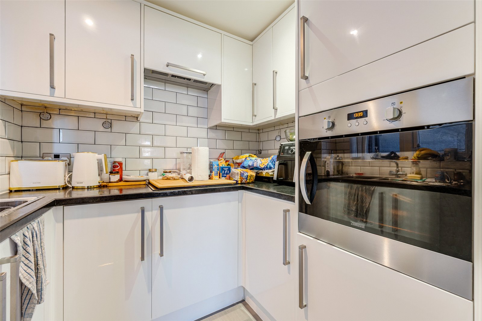 Adjoining the living space is a modern fitted kitchen, finished with white wall and base units, contrasting black worktops, and integrated appliances.