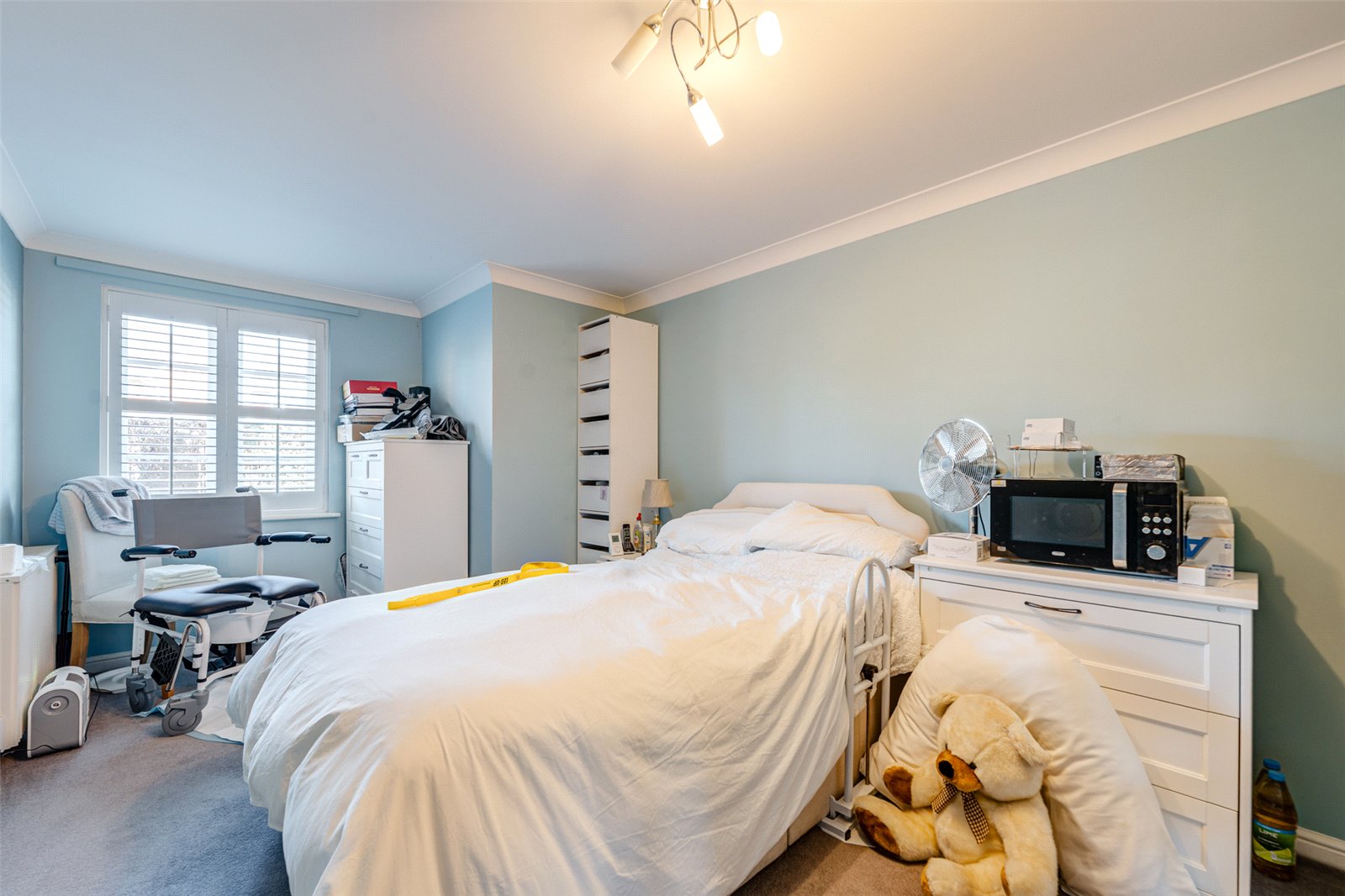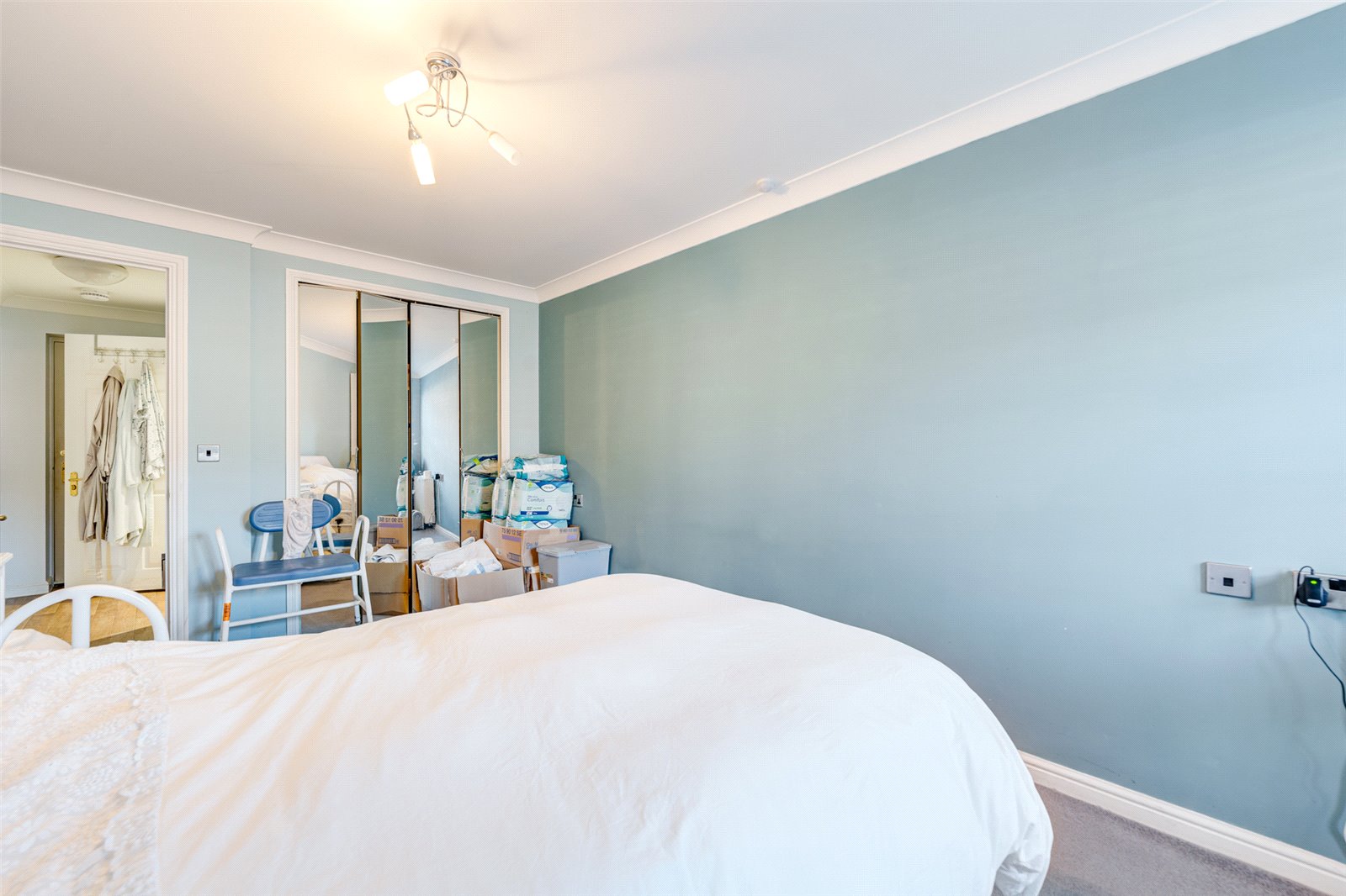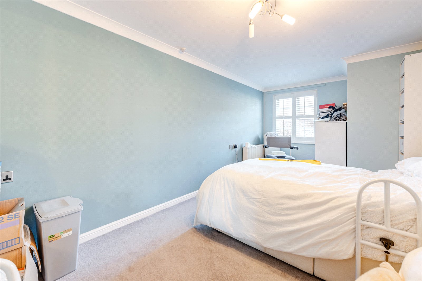 The double bedroom is generous in size and features a built-in wardrobe, along with additional space for a bed, side tables, and drawers. Natural light enhances the room’s comfortable feel.