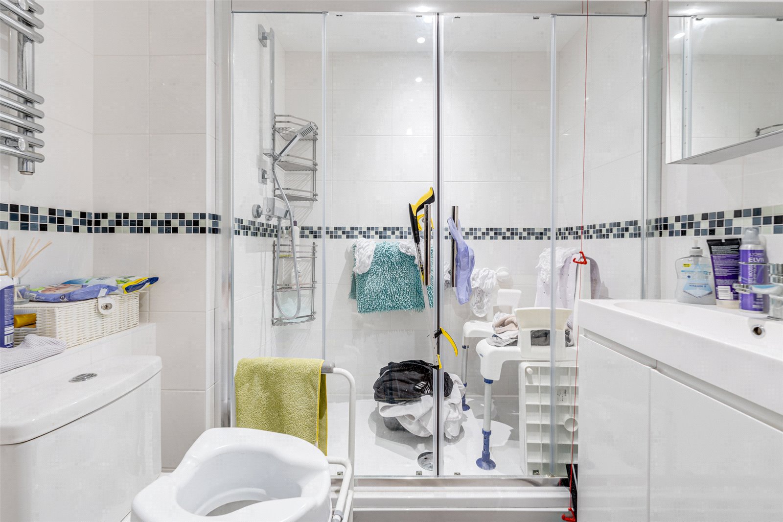 The modern shower room includes a walk-in shower with safety handrails, a wash basin set within a vanity unit for added storage, and a WC.