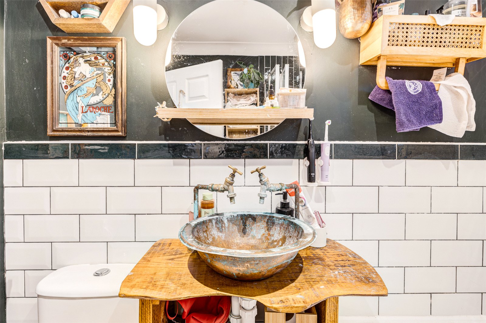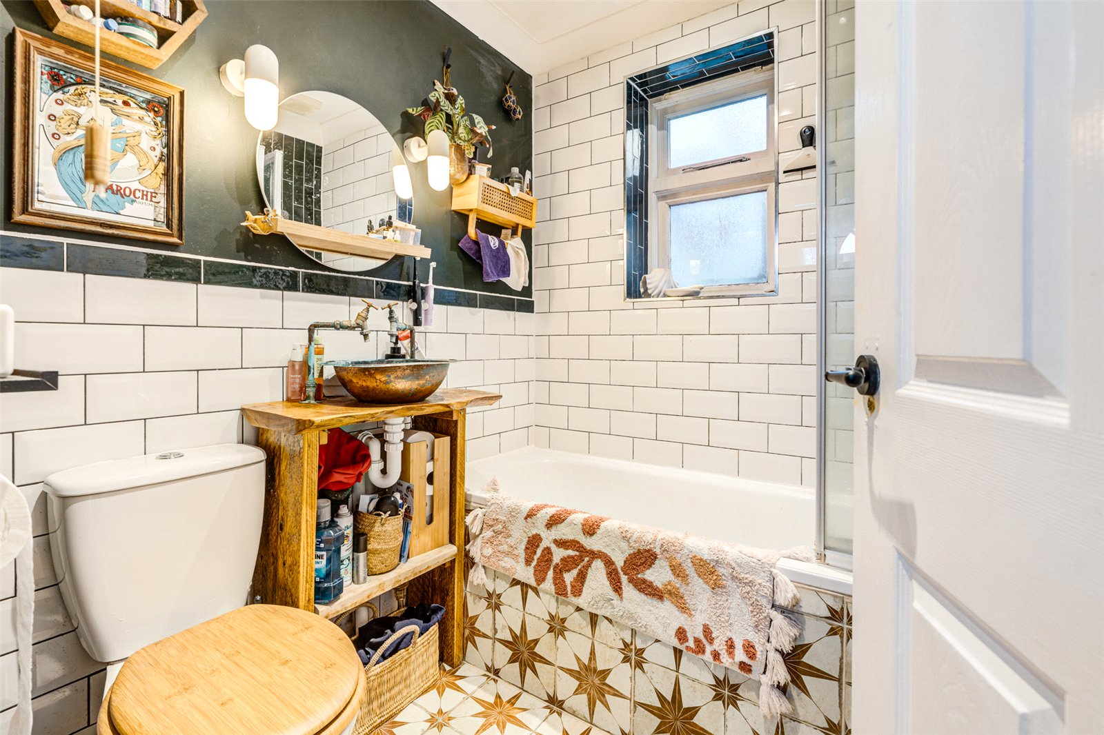 The contemporary bathroom comprises a fitted bath with overhead shower, an integrated basin with storage, and a WC.