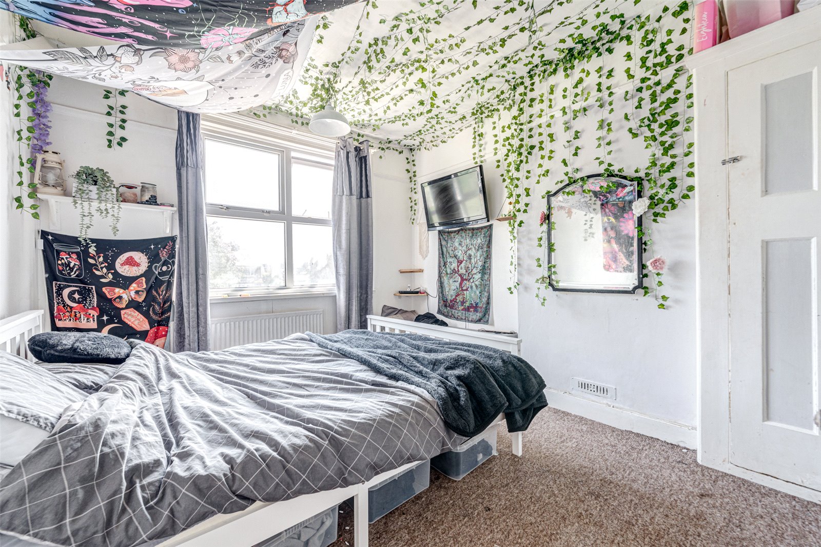 The second bedroom, accessed through strip wooden doors, is filled with natural light and offers room for wardrobe furniture. It includes a picture rail, adding a touch of character to the space.