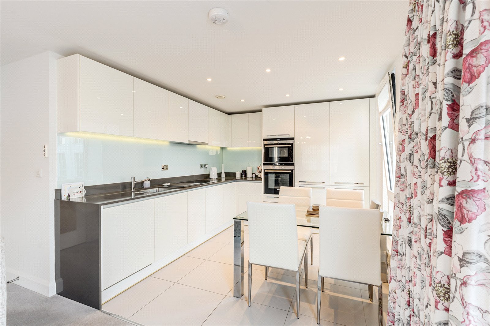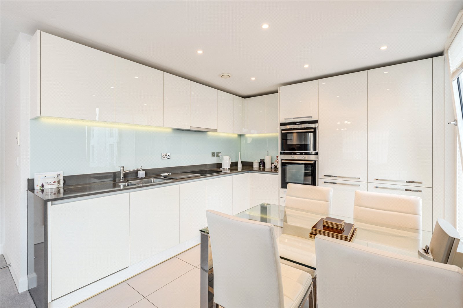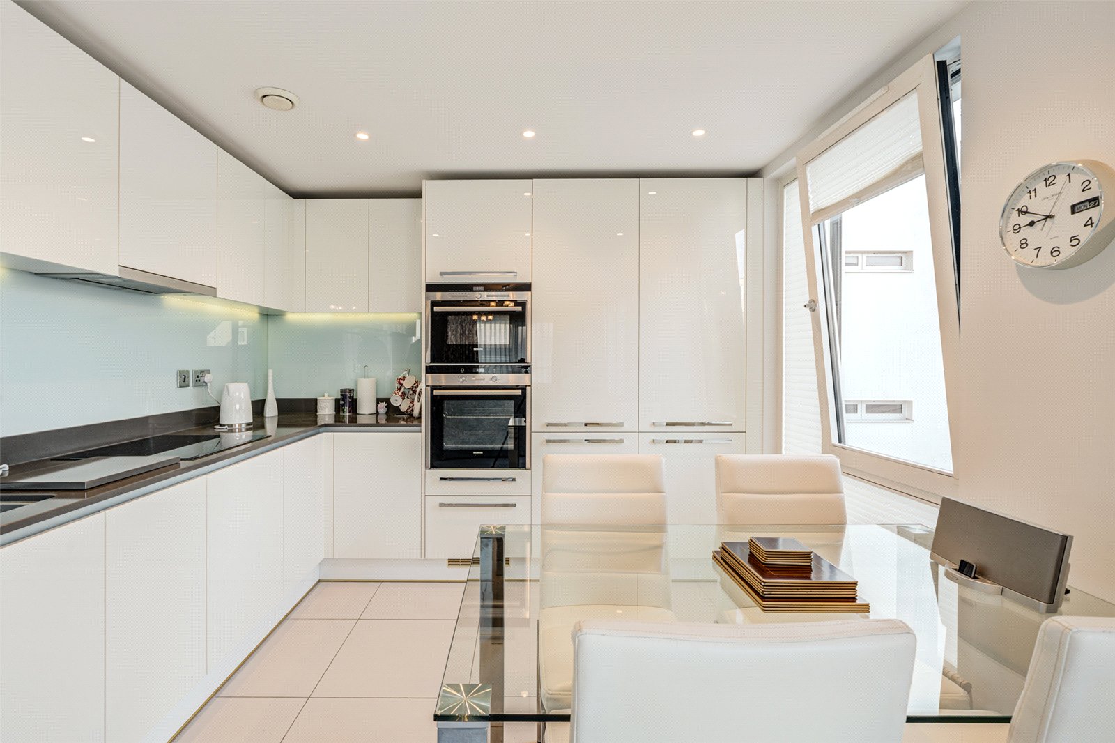 The contemporary kitchen is fitted with a comprehensive range of base and wall-mounted units, complemented by ample worktop space. It comes complete with a host of integrated appliances, including a fridge/freezer, double oven, hob, and dishwasher. There is also room for a small dining table and chairs, creating a sociable and practical cooking and dining area.