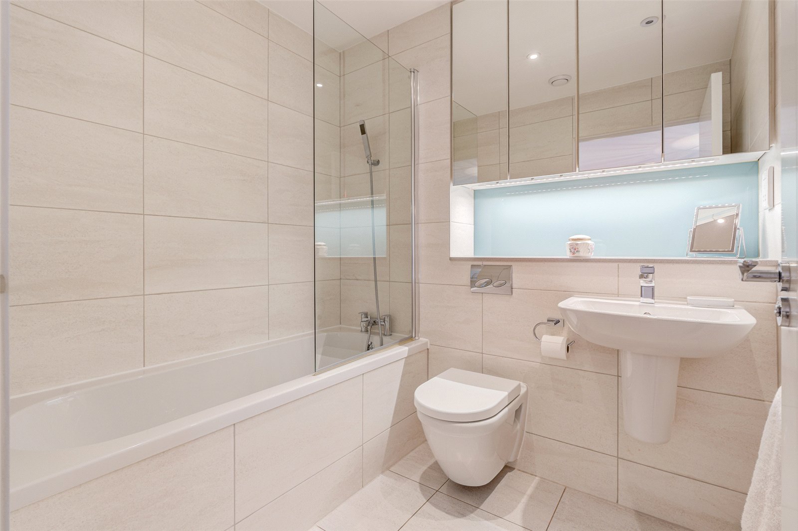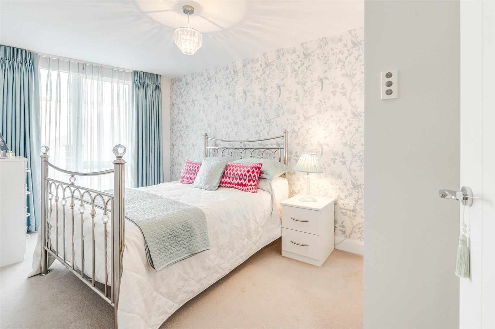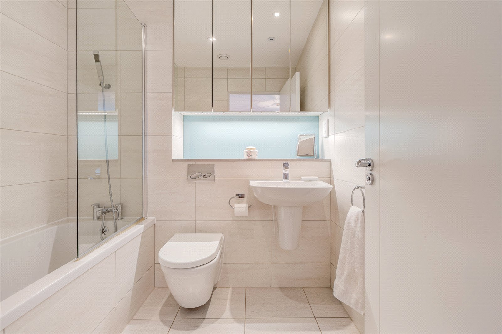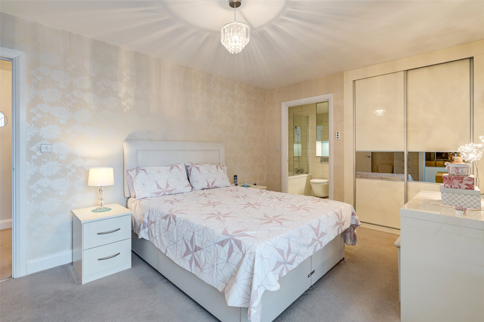 The master bedroom is a spacious double, featuring built-in wardrobes and plenty of room for additional furnishings. Its en suite bathroom offers a sleek, modern finish with fully tiled walls, a bath with overhead shower, WC, and wash hand basin. The second bedroom, also a comfortable double, benefits from a fitted wardrobe and flexibility for further furniture.