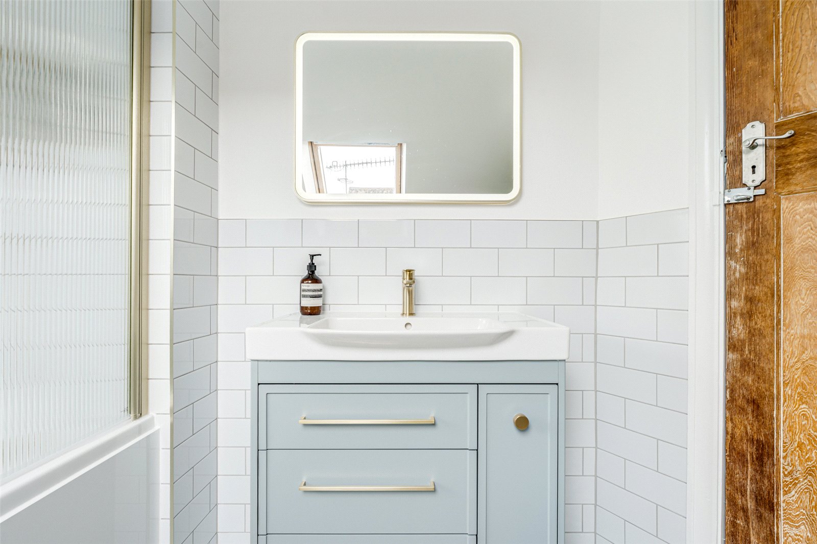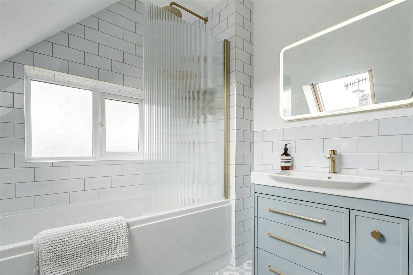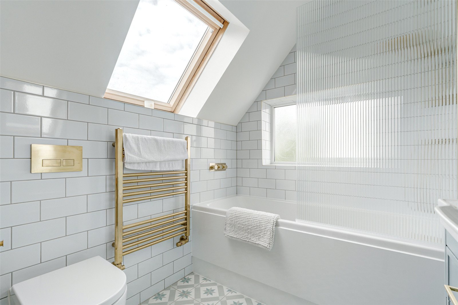 Upstairs, the first floor hosts three further well-proportioned bedrooms. The spacious master bedroom features built-in wardrobes and a stylish en suite shower room with modern fittings, including a vanity unit, WC, and walk-in shower. The two remaining bedrooms are generously sized for small double beds and additional furniture. A beautifully designed family bathroom completes the upper level, showcasing partial tiling, a bath with overhead shower, vanity unit, WC, heated towel rail, and elegant gold hardware throughout.