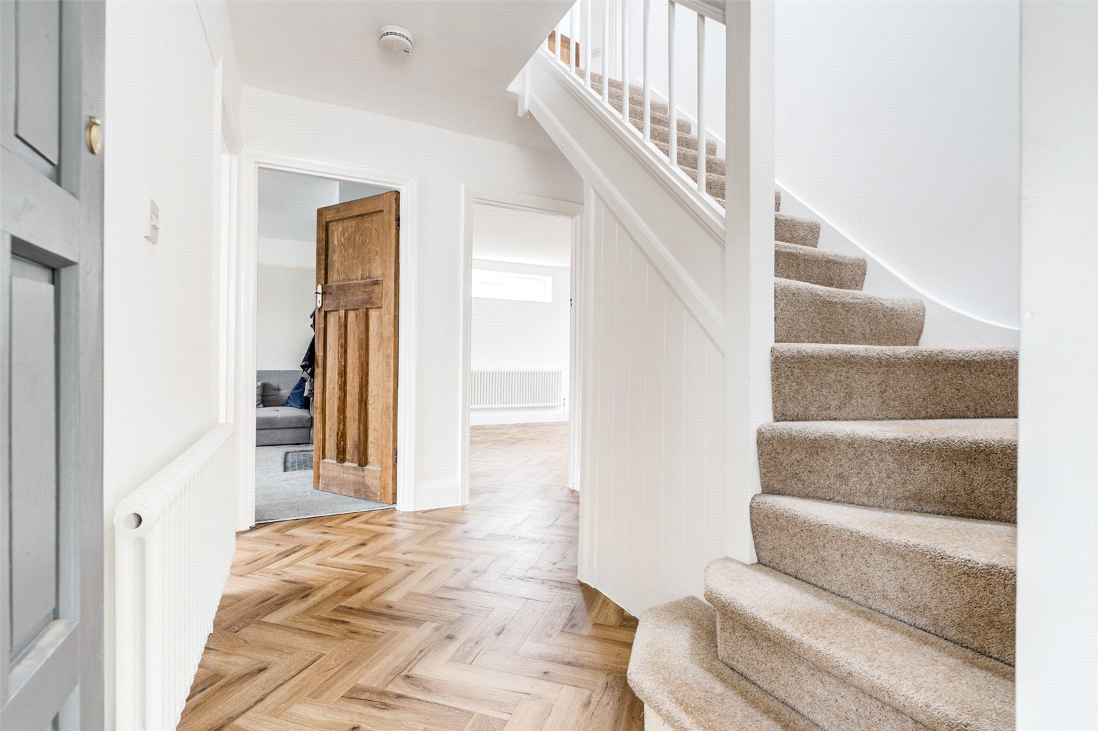 Upon entering, you are greeted by a welcoming porch area—ideal for storing coats and shoes—leading into a spacious hallway adorned with stylish wood-effect herringbone flooring. An understairs cupboard offers convenient storage for everyday essentials.
