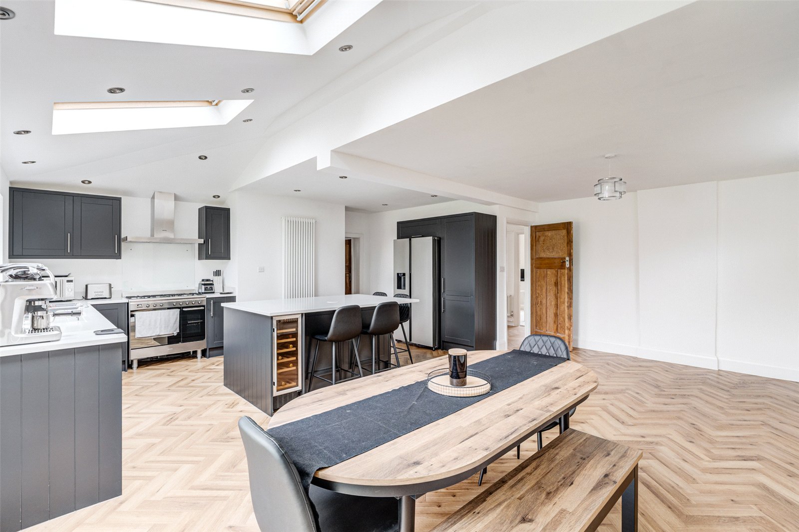 The heart of the home is the impressive open-plan kitchen/dining area, featuring matching herringbone flooring throughout. The kitchen is fitted with a range of sleek wall and base units, generous worktop space, an integrated dishwasher, and room for further appliances. A central island provides extra preparation space and breakfast bar seating. The dining area offers ample room for a family table and even additional seating, making it a superb space for entertaining.