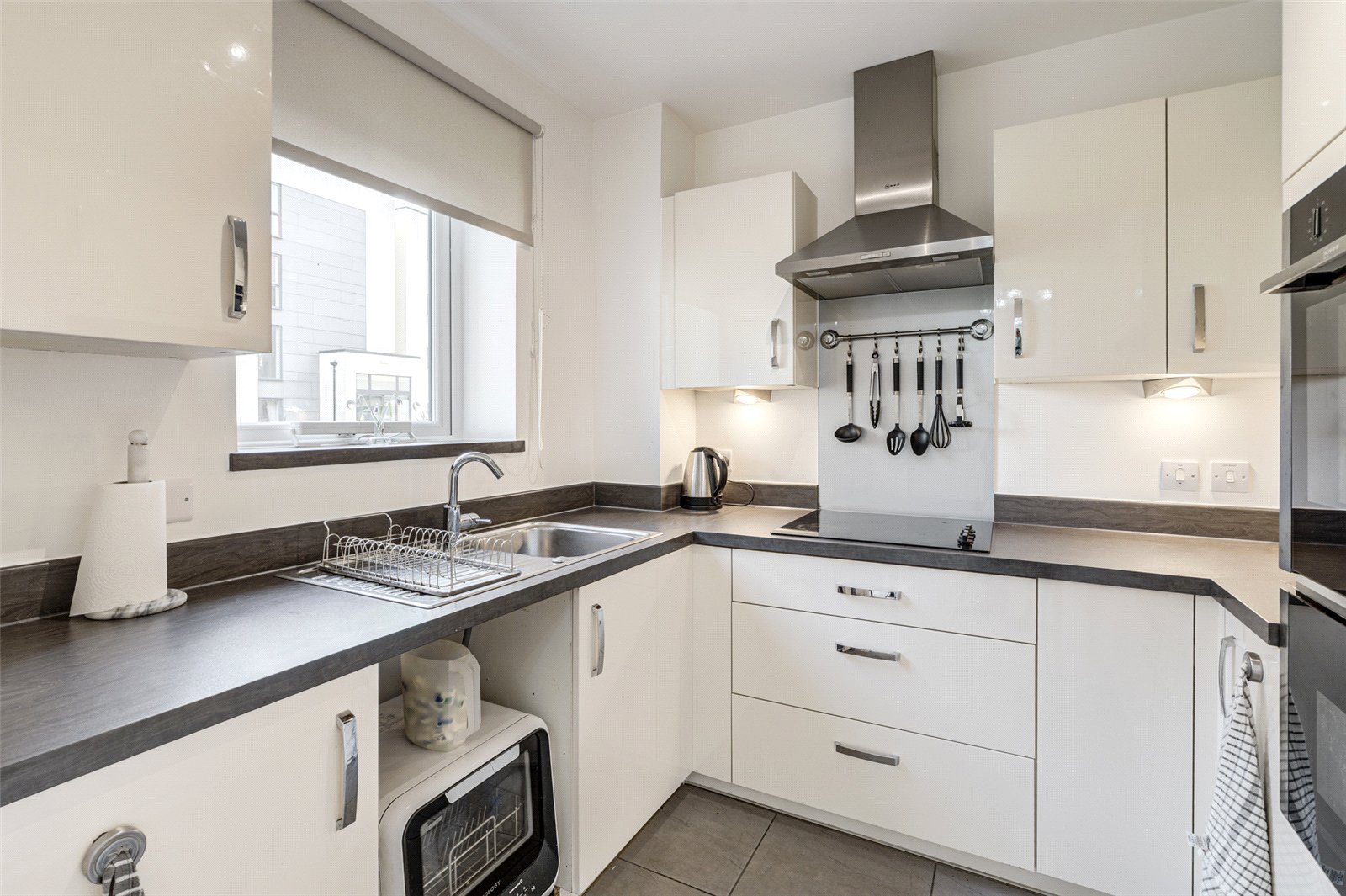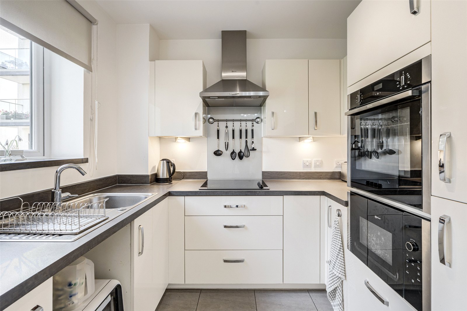 The modern fitted kitchen, accessed via the living area, features sleek white wall and base units providing plenty of storage for kitchen facilities and includes a range of integrated appliances for convenience.
