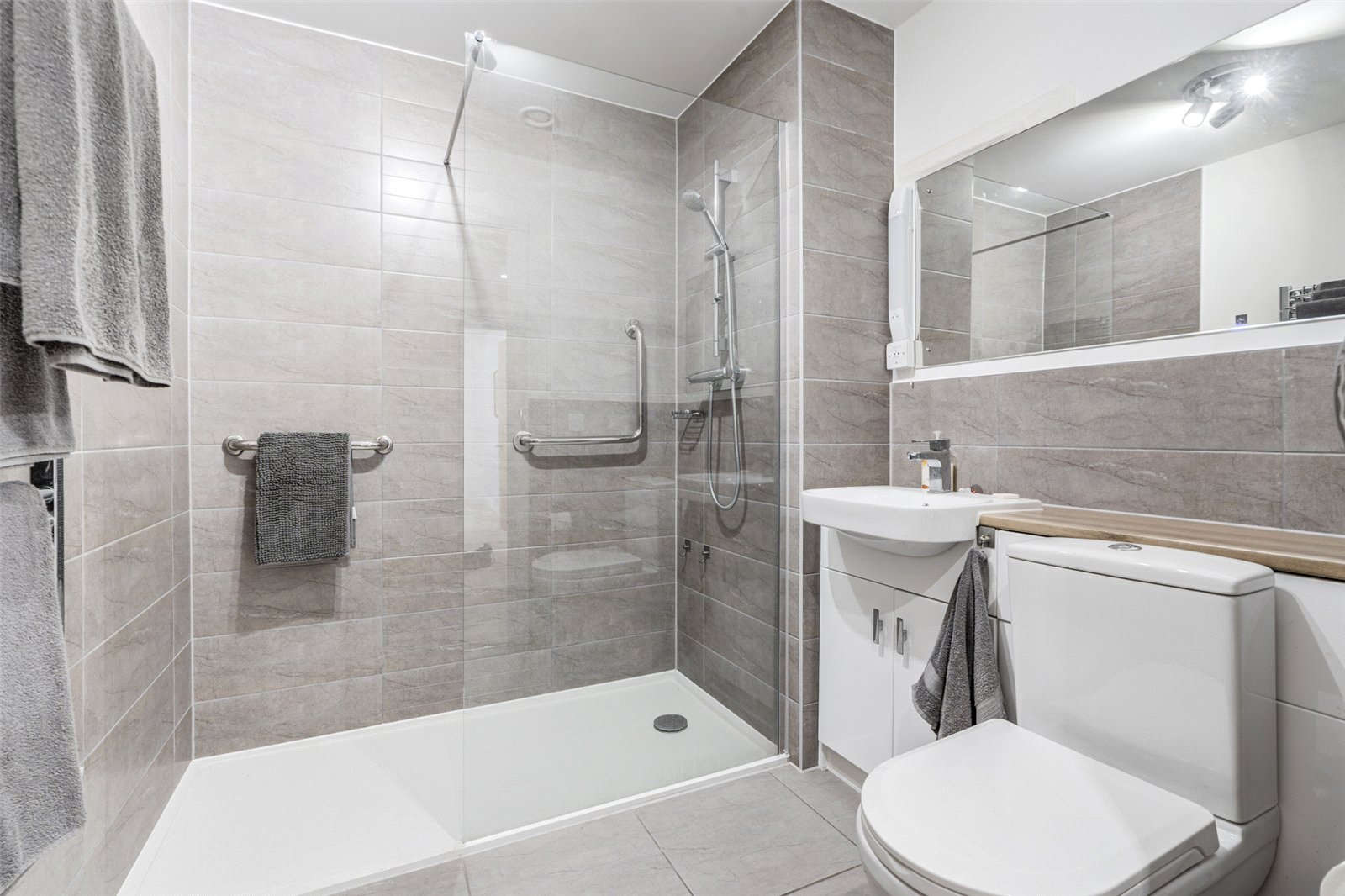 The contemporary shower room is fitted with a modern suite, including an integrated wash basin with storage and a WC.