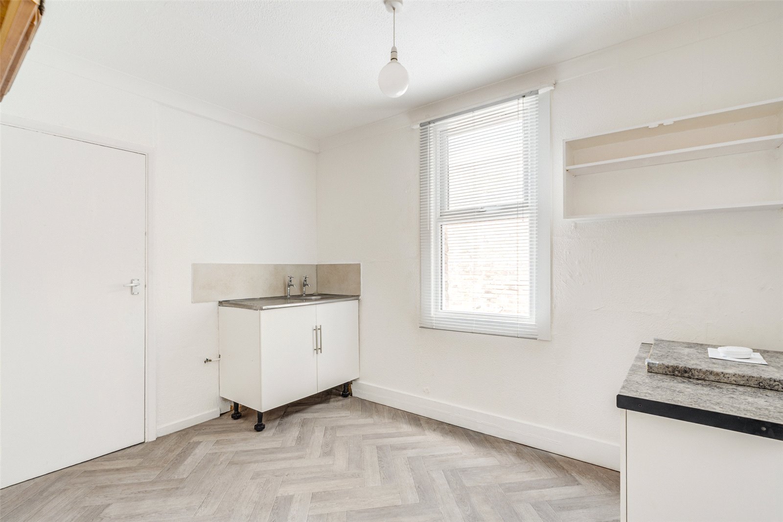 The kitchen, offers space for appliances, base and wall level units and is complemented by attractive herringbone-style flooring that enhances the contemporary feel.