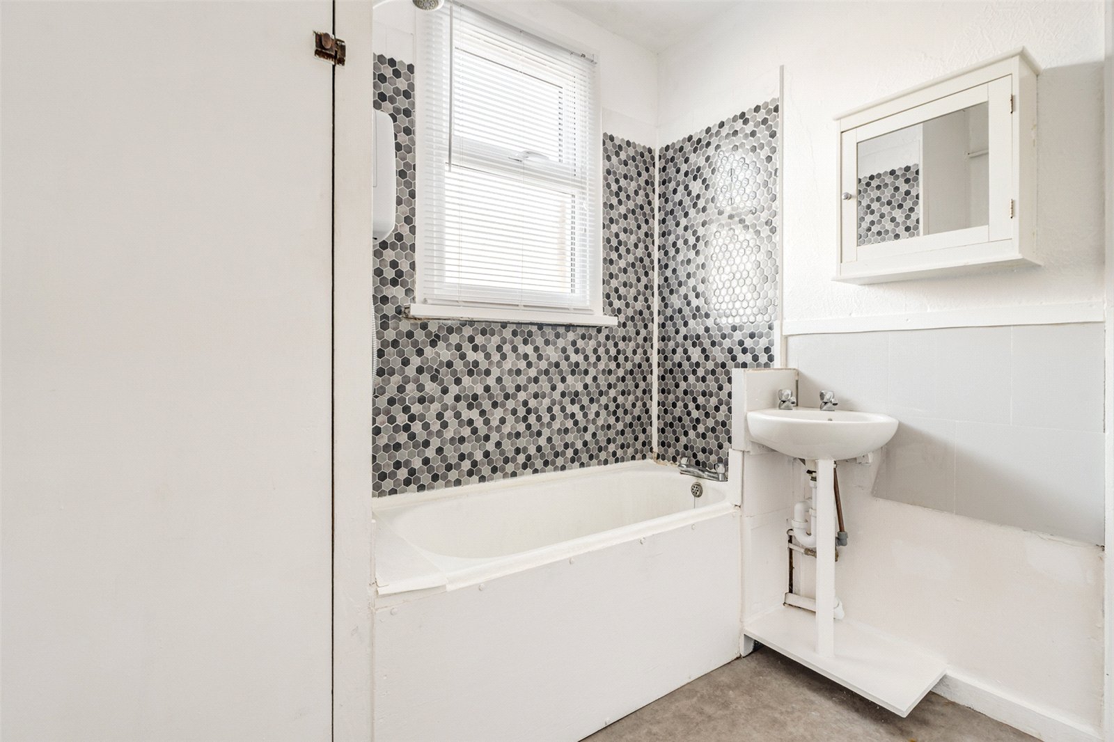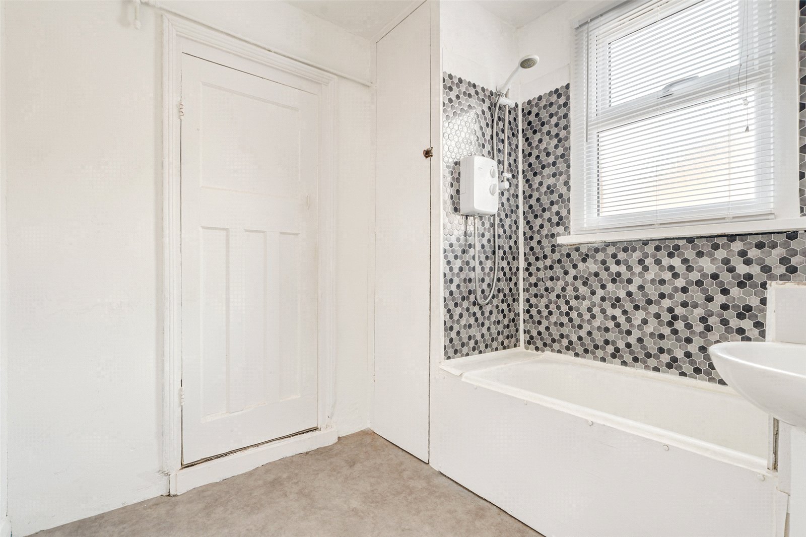 The modern bathroom features honeycomb-style tiling, a bath with overhead shower, wash hand basin and WC.