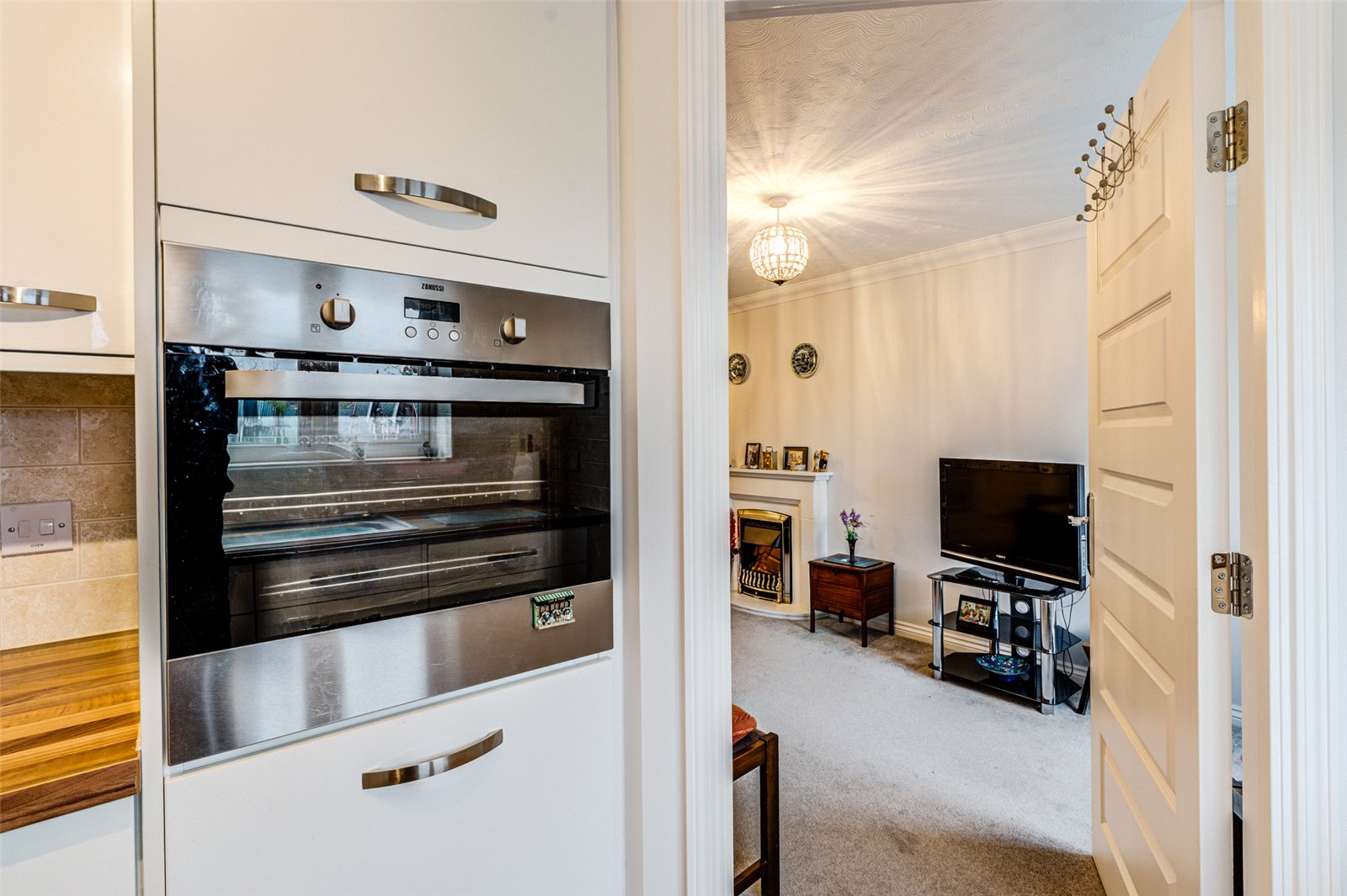 From the living room, the modern kitchen is well-appointed with a range of base and wall-mounted units, generous worktop space, and built-in appliances including a hob and oven—ideal for those who enjoy cooking.