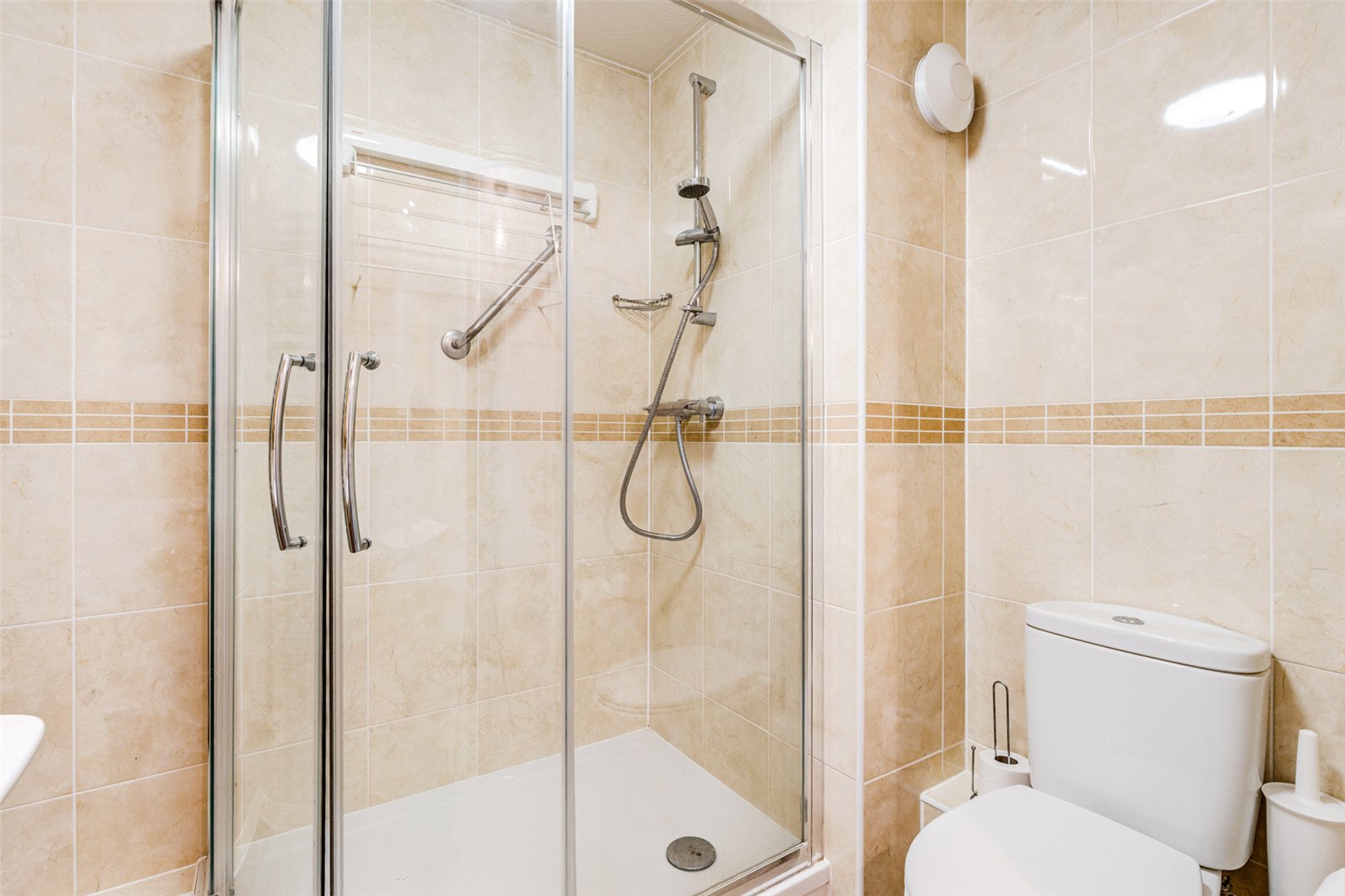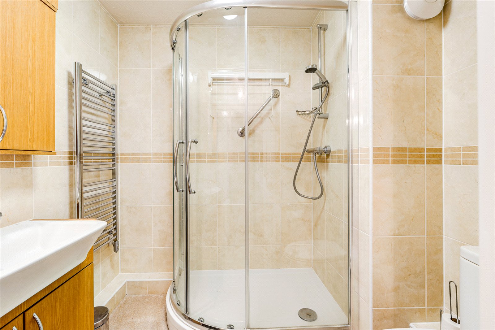 The contemporary shower room offers a calming space to unwind, featuring a corner shower unit, WC, vanity sink unit, fully tiled walls, and a heated towel rail.