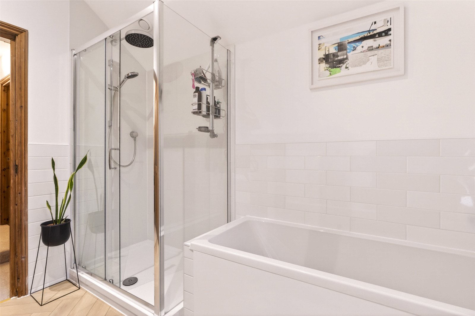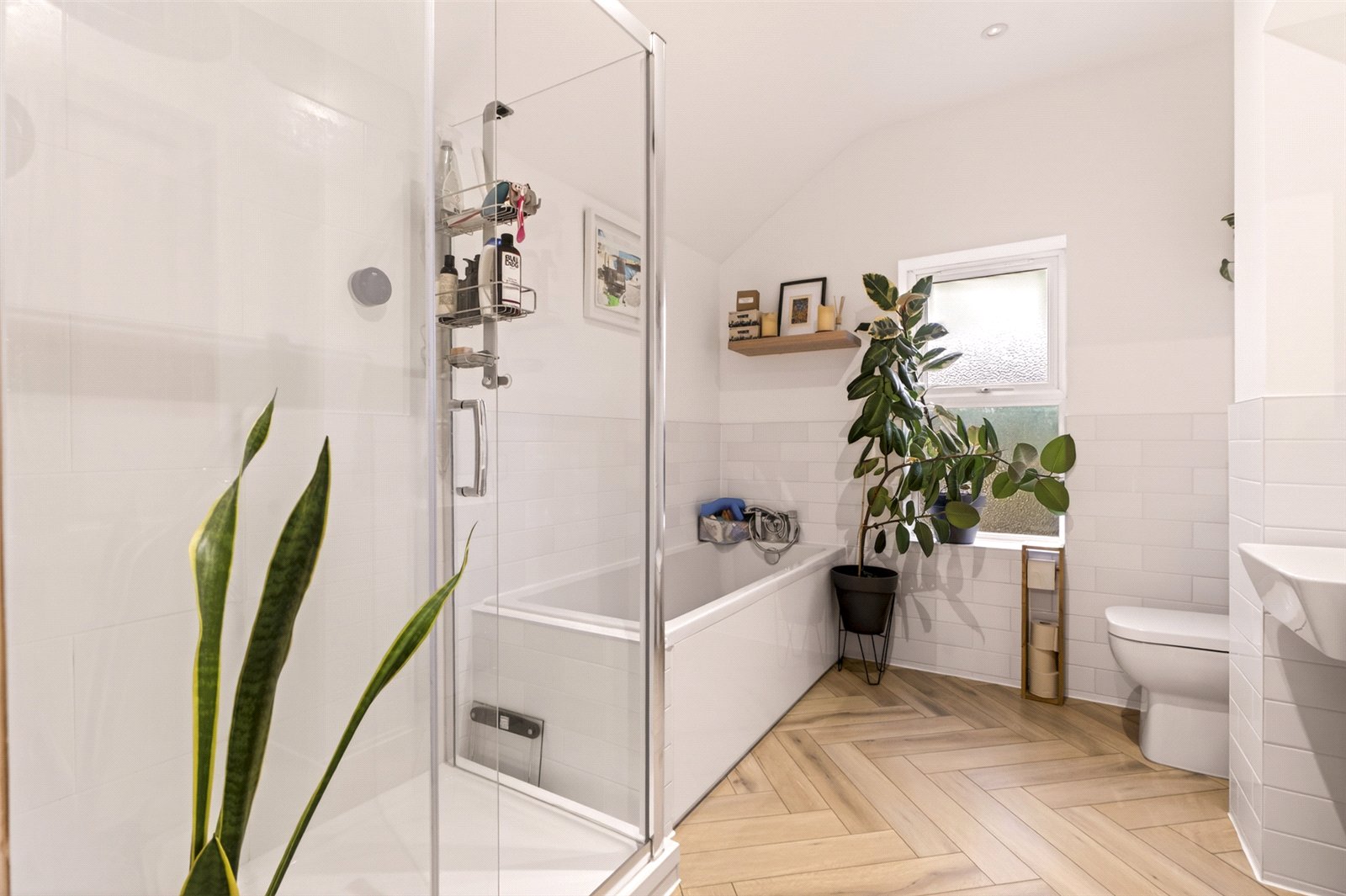 The modern family bathroom is fitted with a bath and overhead rainfall shower, complemented by stylish herringbone style flooring, a WC, and wash basin. A convenient built-in storage cupboard is located adjacent to the bathroom.