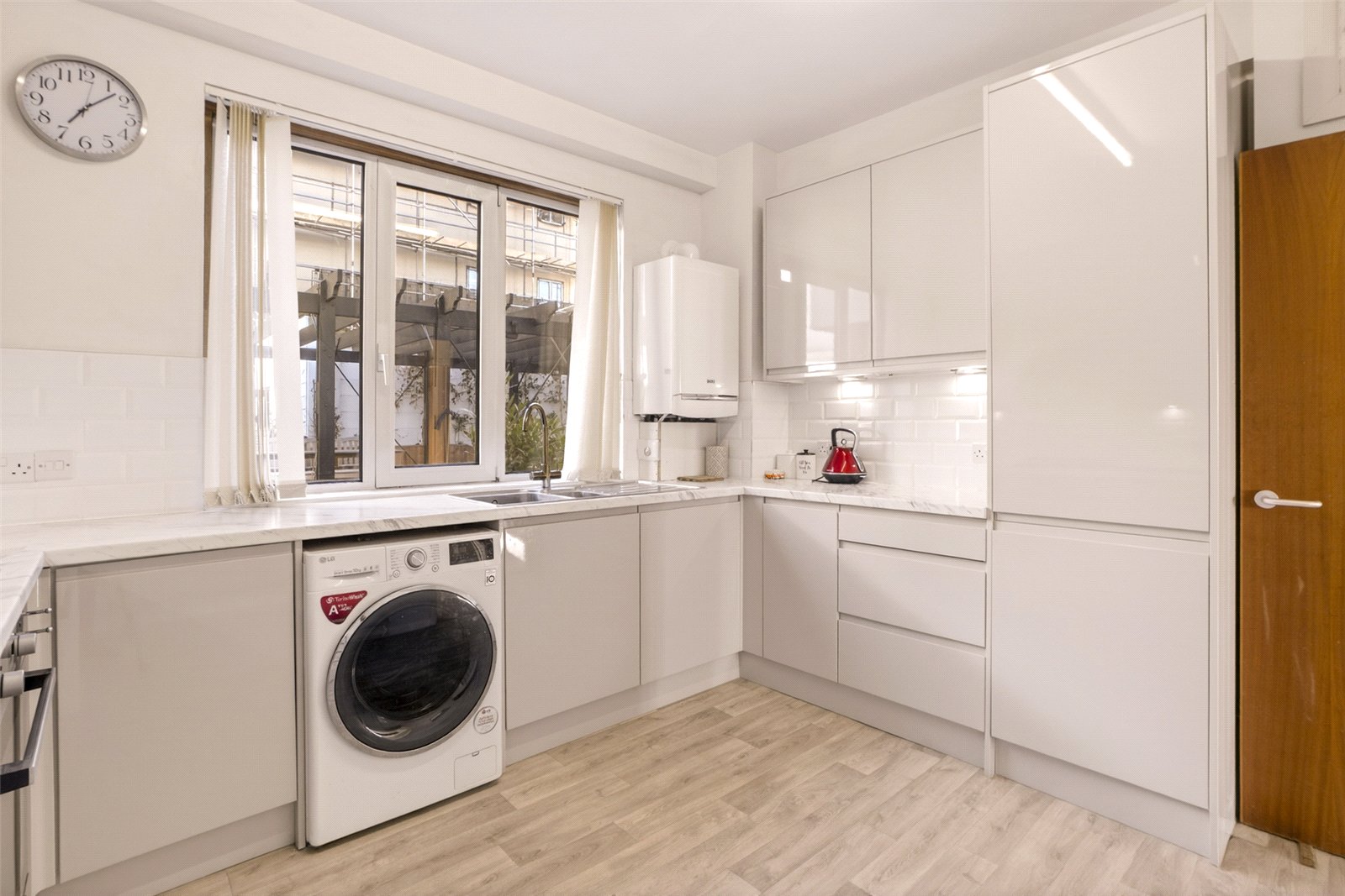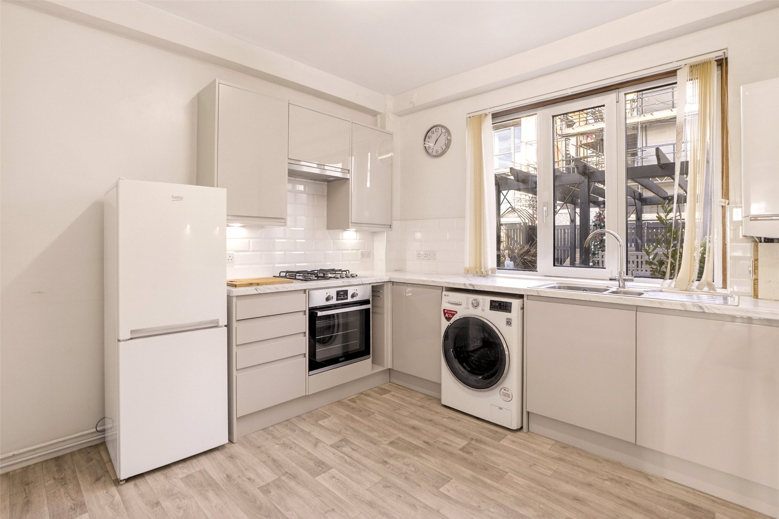The modern fitted kitchen is finished with a range of base and wall units, complemented by marble-effect worktops. It includes a built-in oven and hob, fridge/freezer, and space for additional appliances.