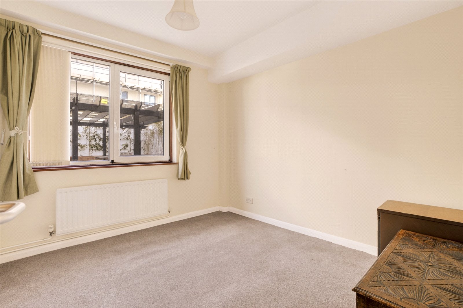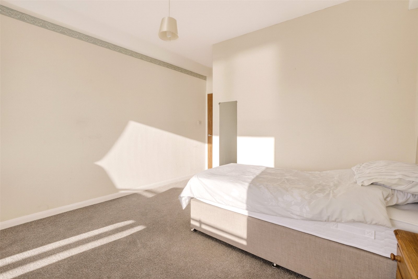 The master bedroom enjoys a bright, south-facing aspect, flooding the room with natural light and offering ample space for a double bed and additional furniture. The second bedroom is also a double and benefits from built-in wardrobes, providing excellent storage solutions.