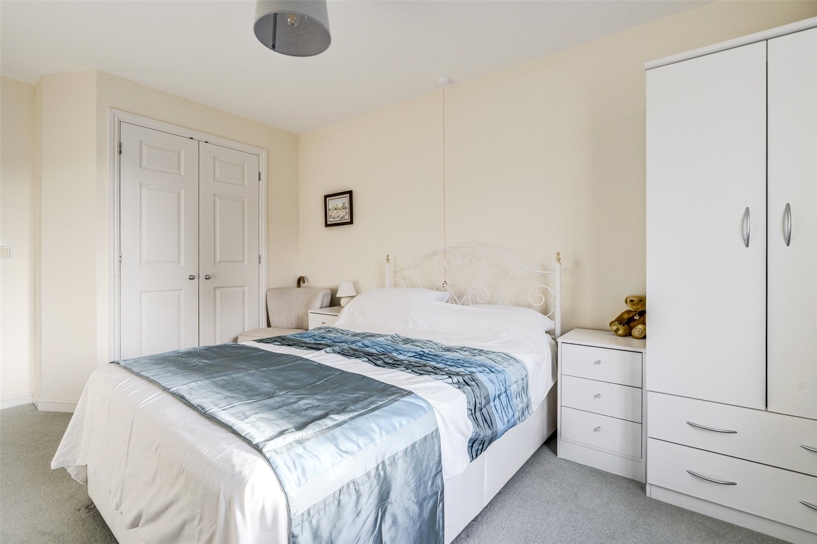 The generously sized bedroom is light and airy and features built-in wardrobes, while still allowing space for additional furniture such as bedside tables and a chest of drawers.