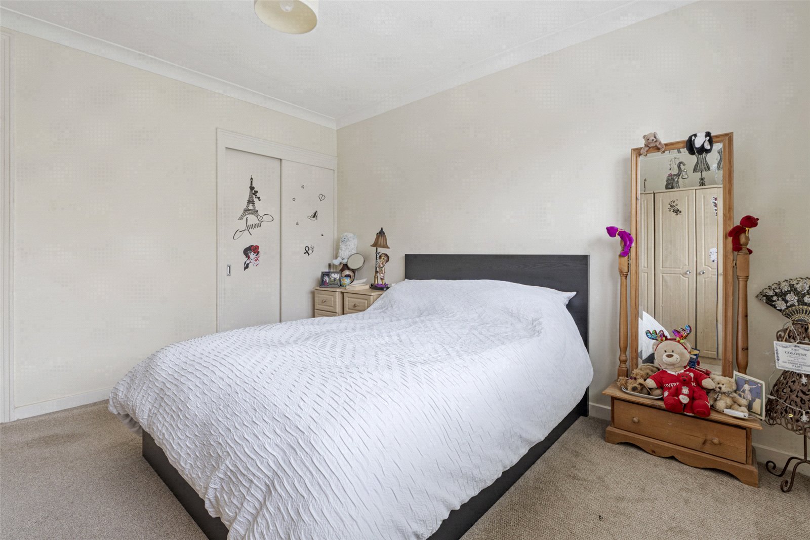 The spacious double bedroom is well proportioned and features built-in wardrobes, offering plenty of storage while still allowing space for additional bedroom furniture such as bedside tables or a chest of drawers.