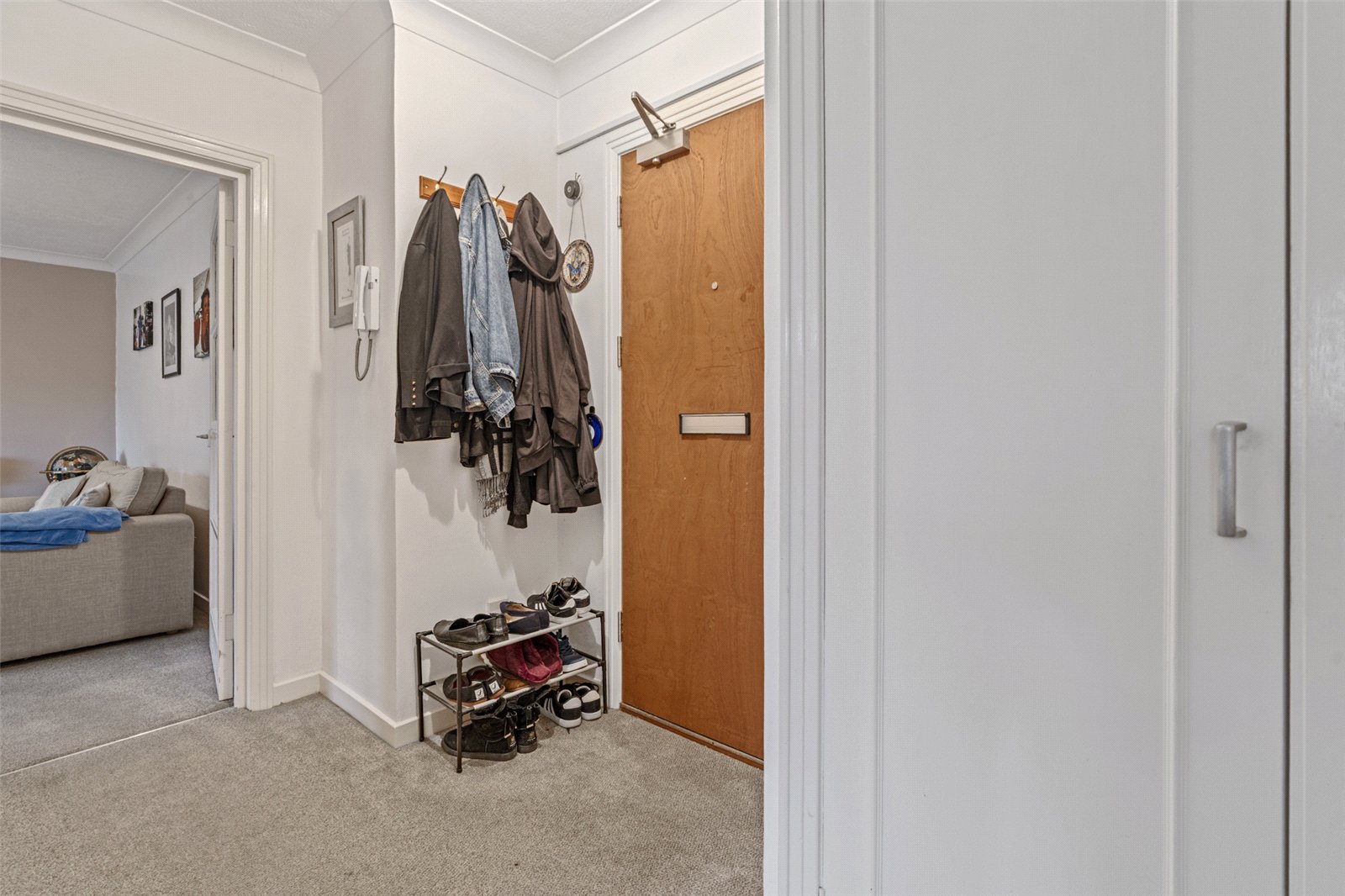 Upon entering the property, you are welcomed into a hallway featuring built-in storage cupboards, offering excellent space for everyday belongings.