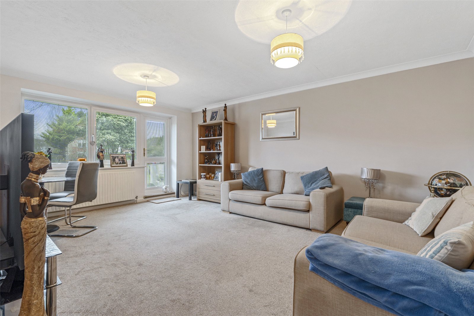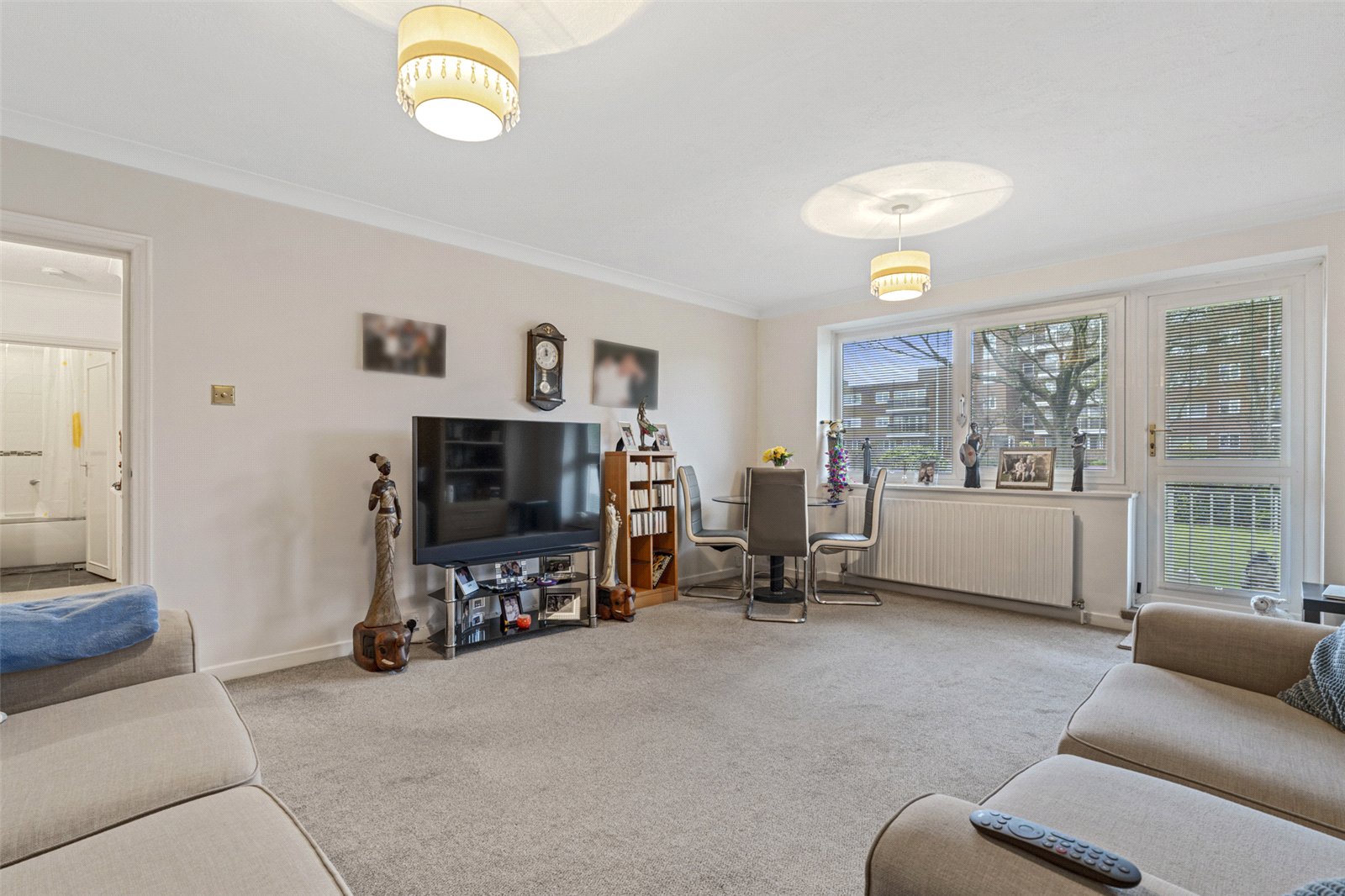 The generously sized open-plan living and dining area provides a bright and versatile space, comfortably accommodating furniture such as a sofa, dining table and chairs. This inviting room benefits from direct access onto the private raised patio, creating an ideal setting for indoor-outdoor living.
