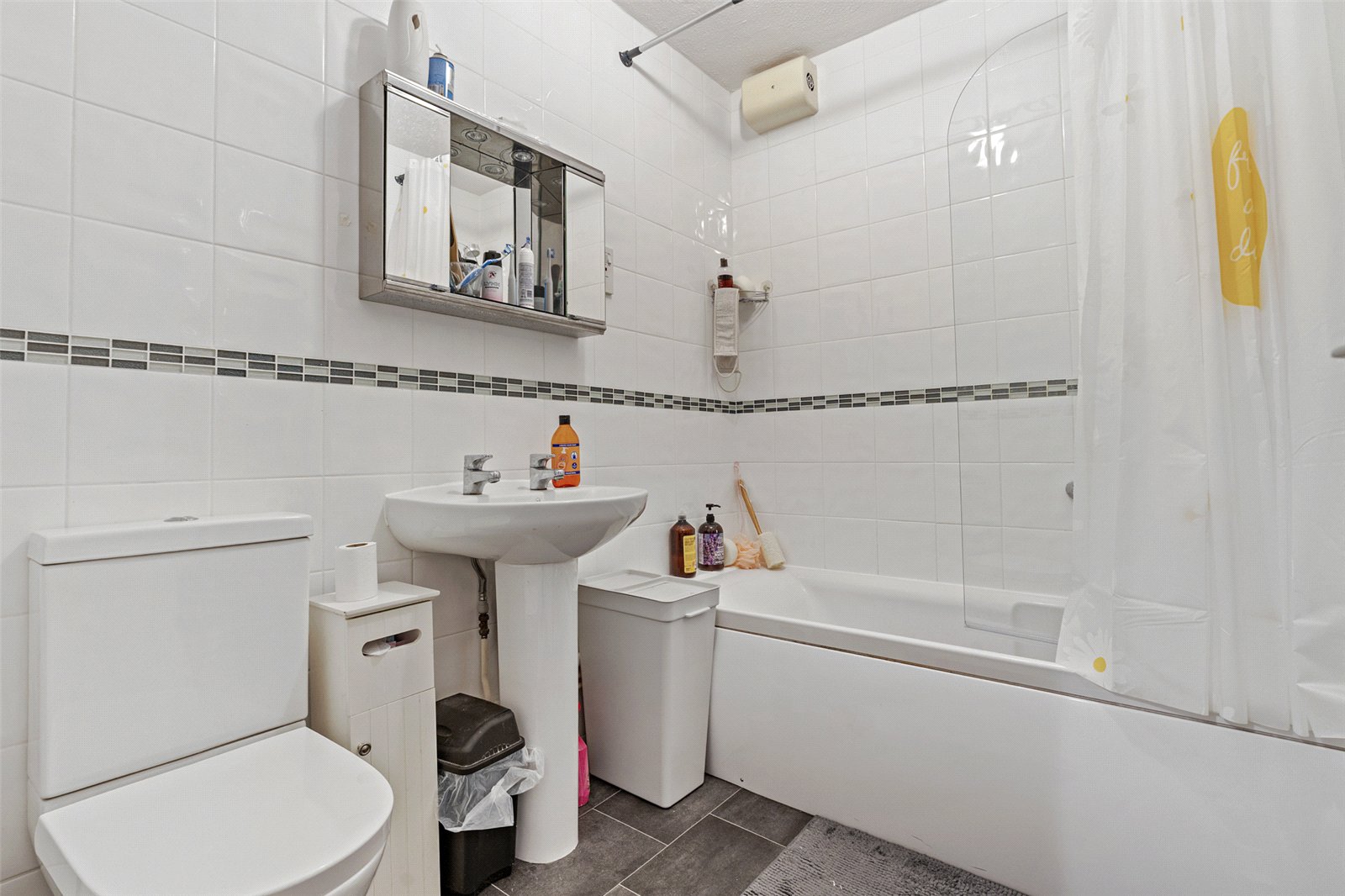 The bathroom is fitted with an overhead shower, wash basin, and WC.