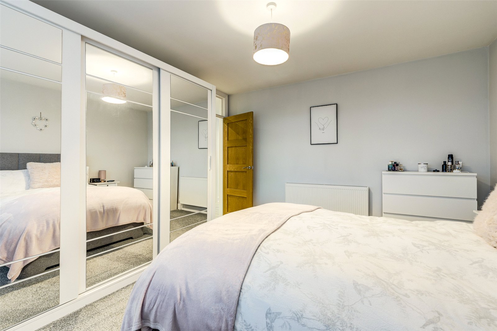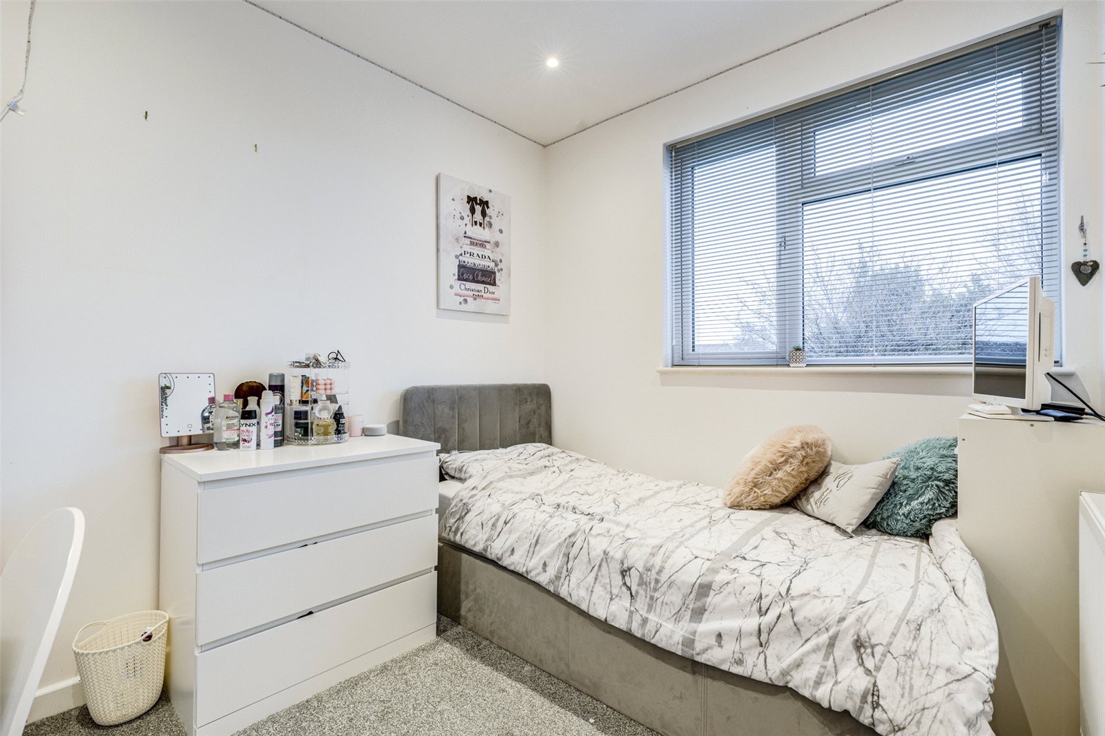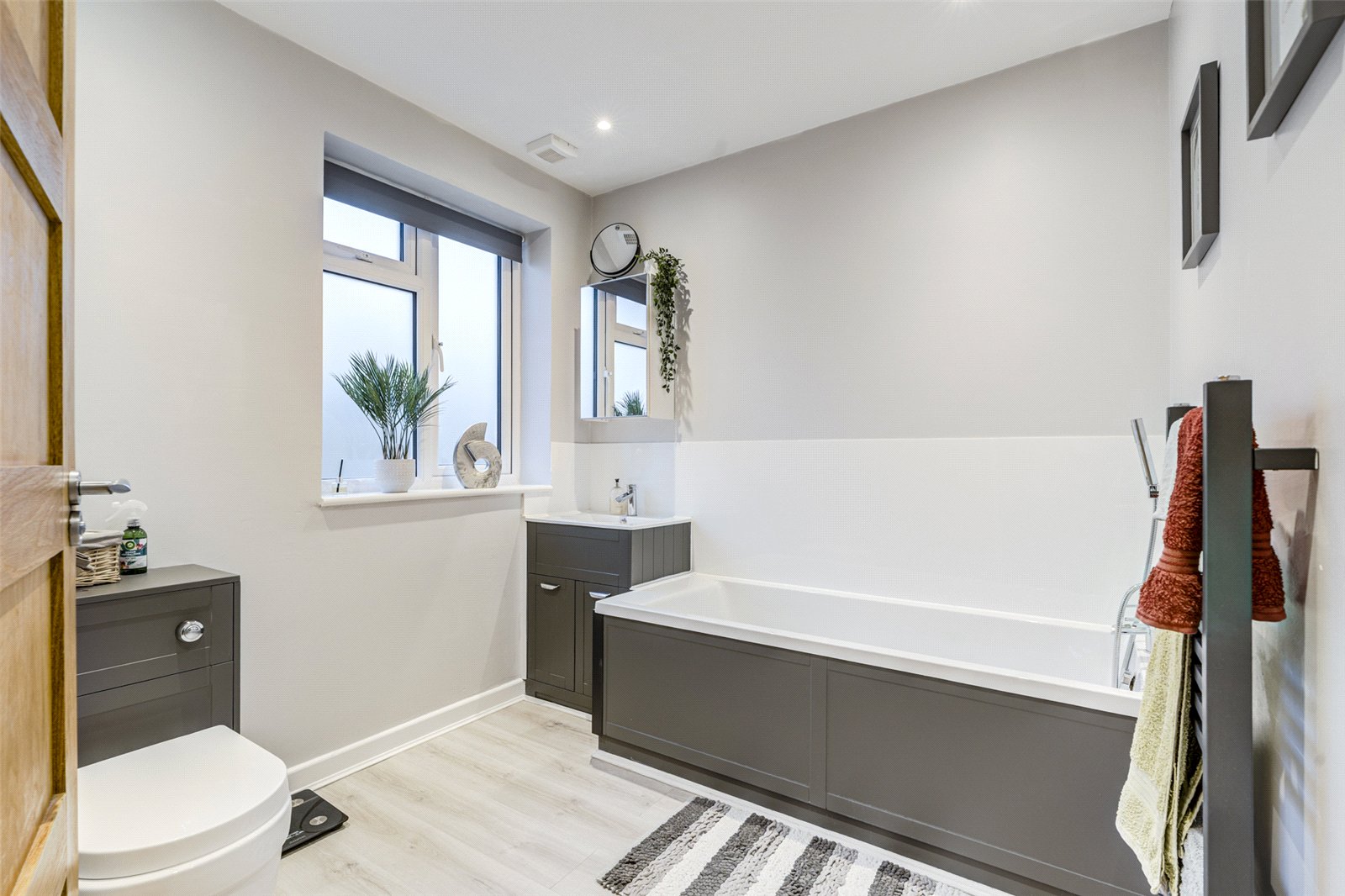 The ground floor also hosts the master bedroom, a spacious double featuring a bay window and ample space for wardrobes and additional furnishings. Completing the ground floor is a modern fitted bathroom comprising a bath with shower attachment, WC, and vanity sink unit.