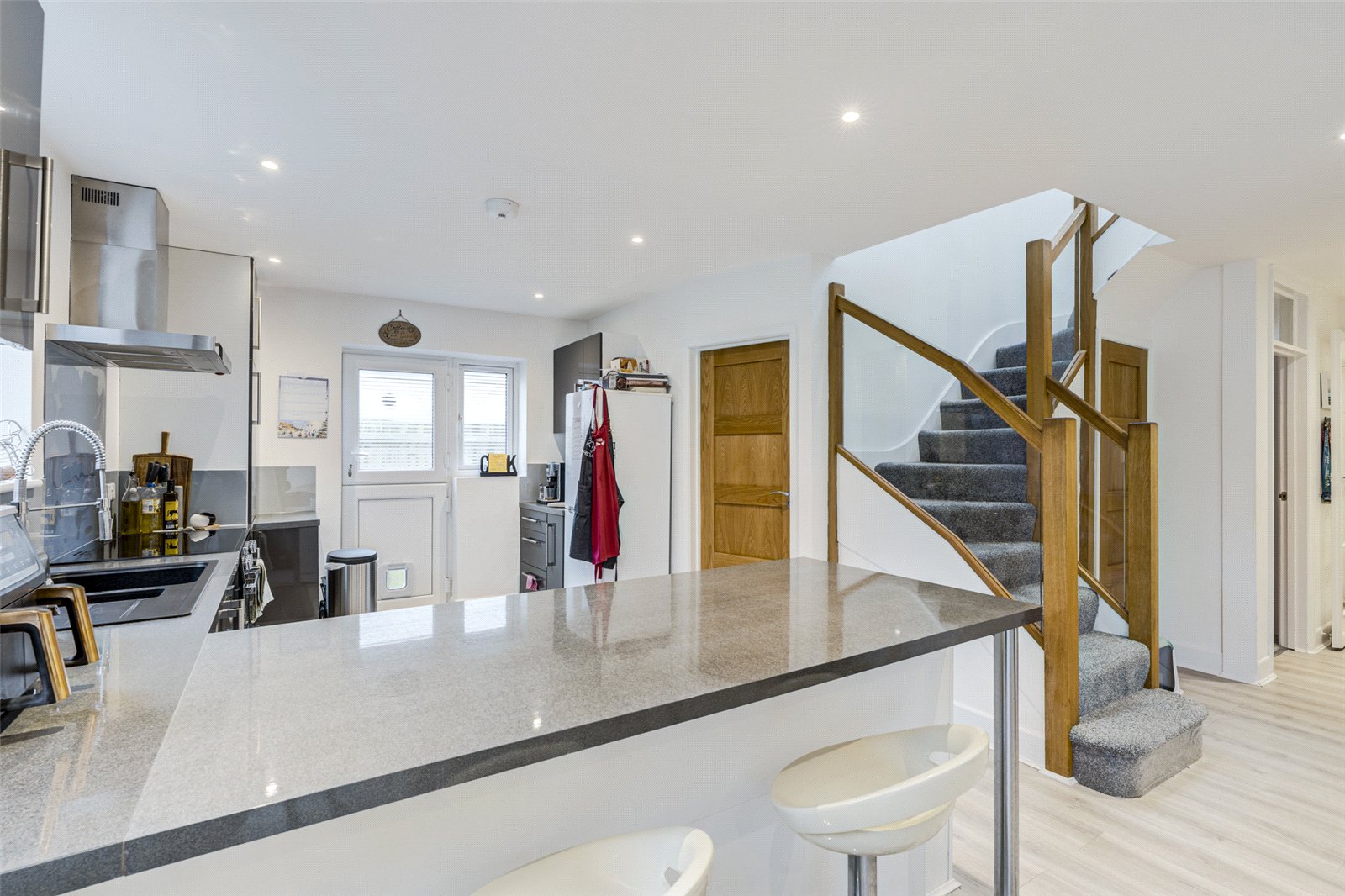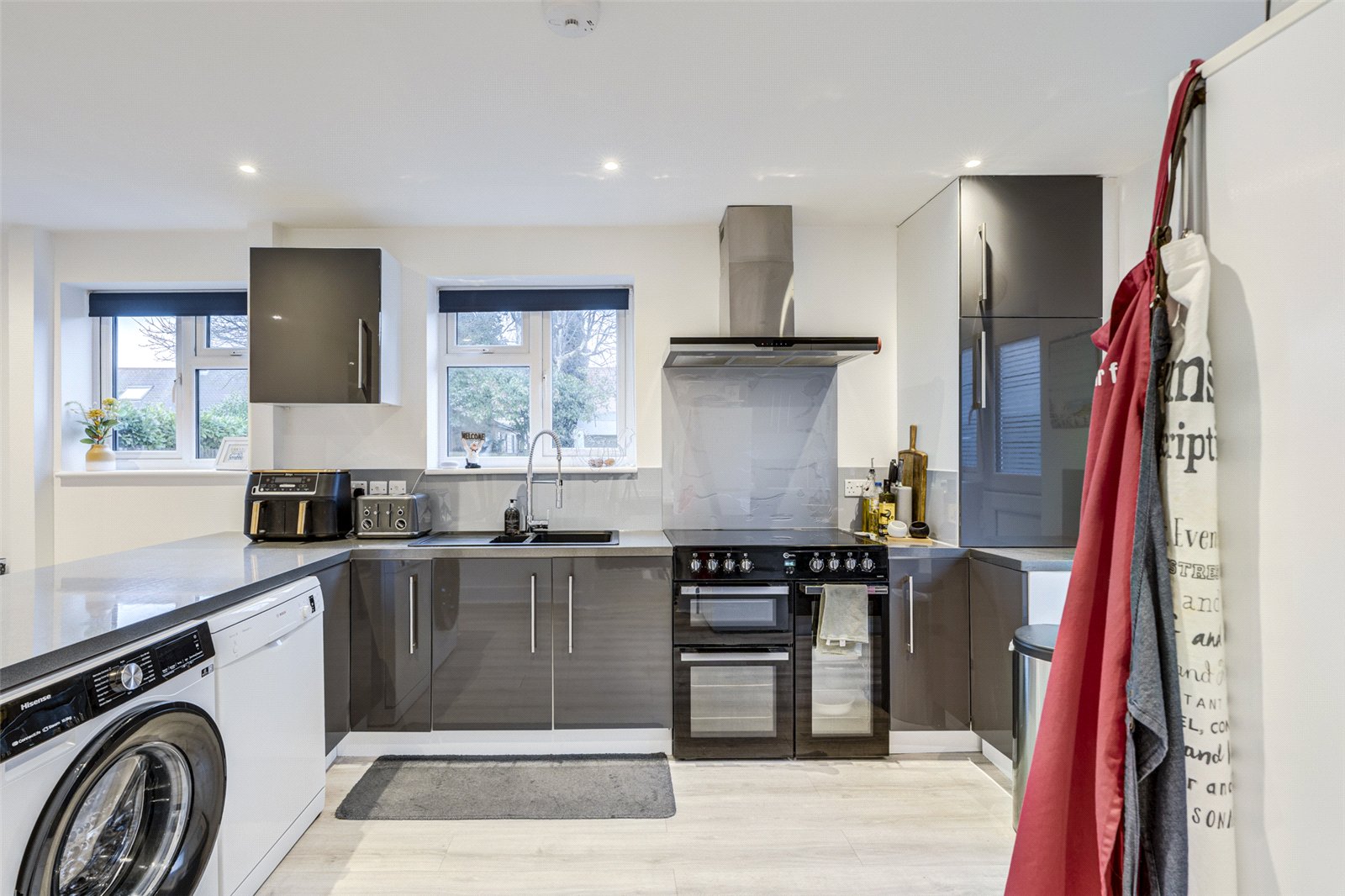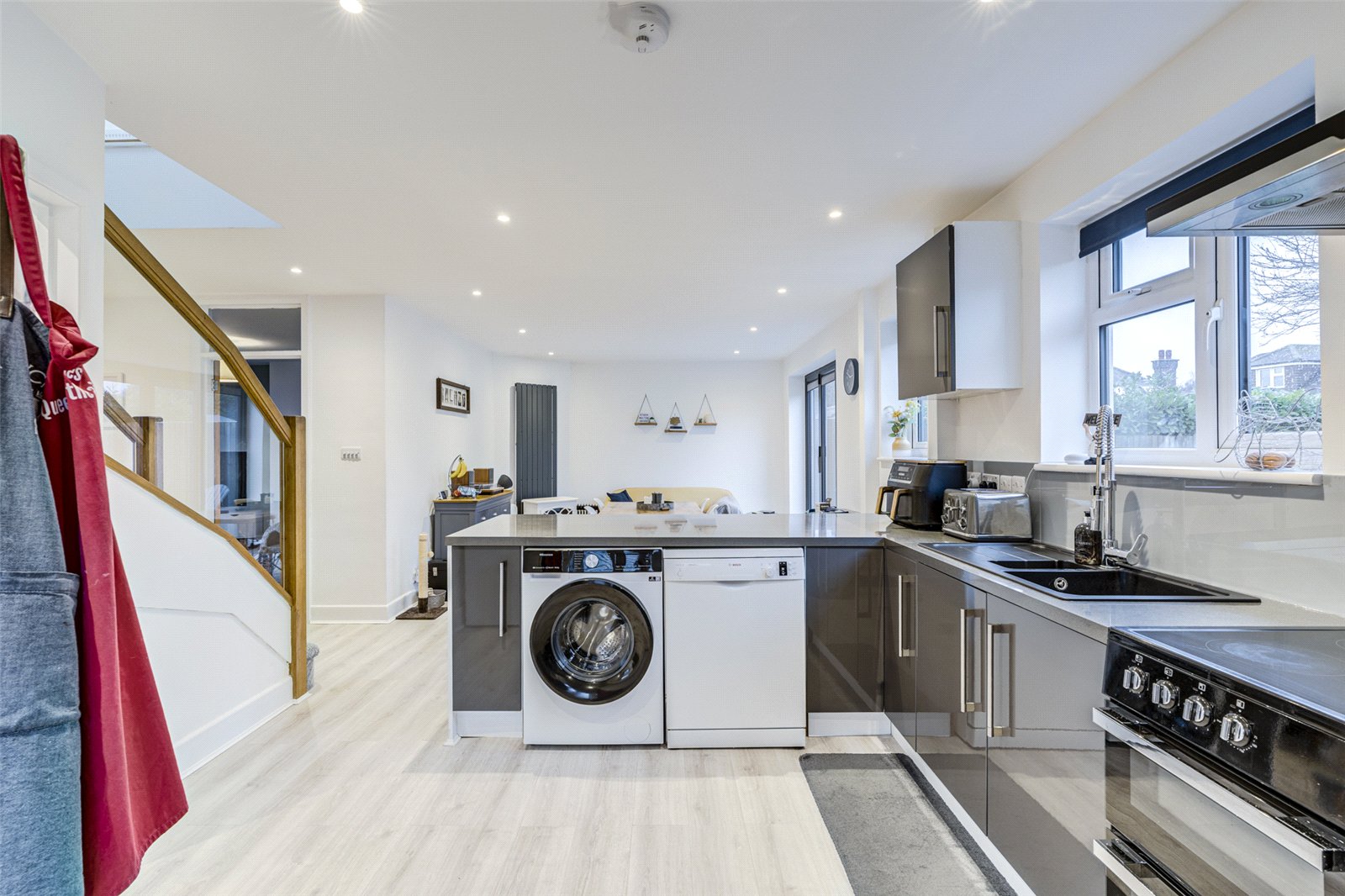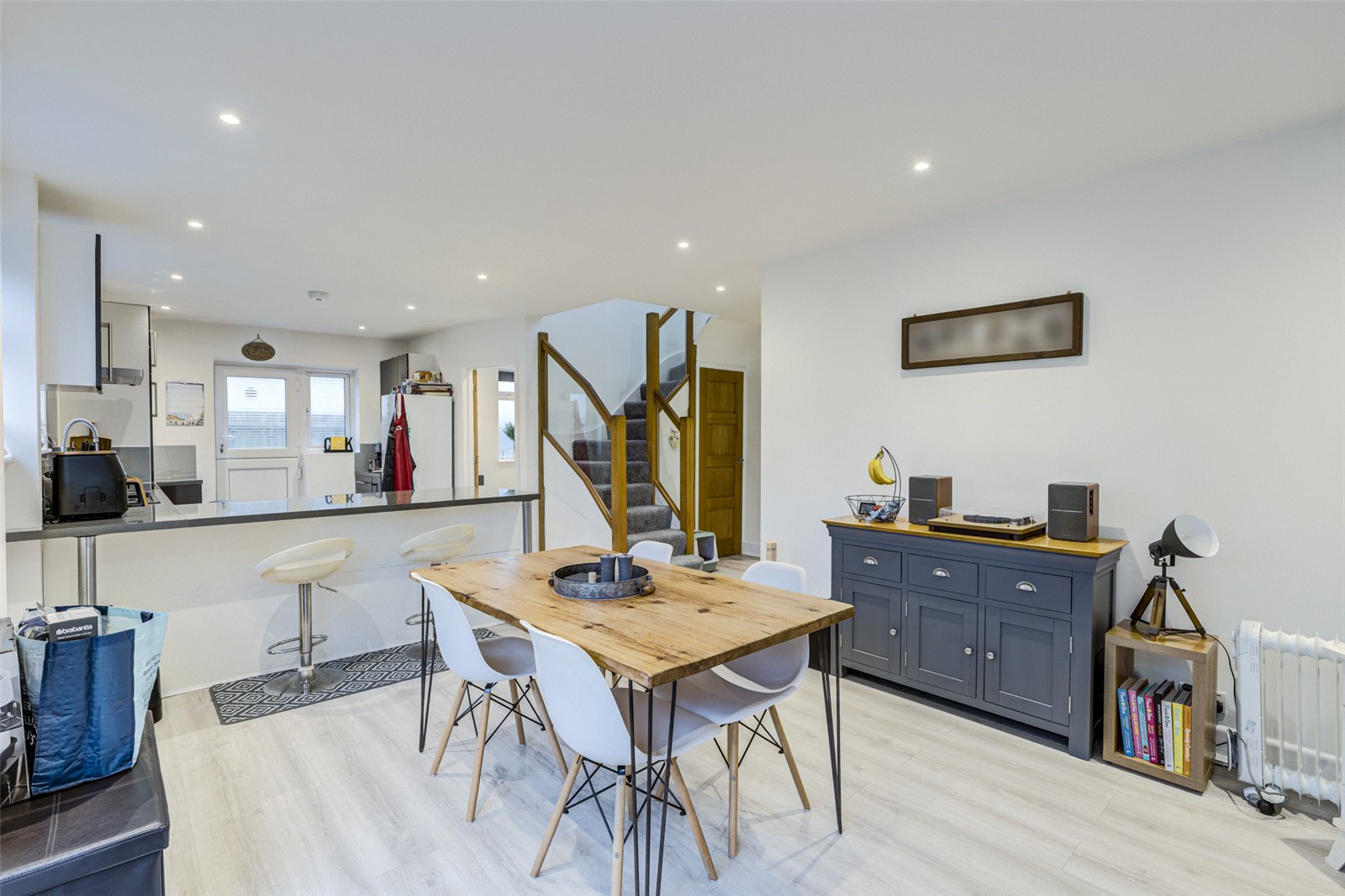 Adjacent to this, the open-plan kitchen/dining area provides an ideal setting for entertaining. The kitchen is fitted with a range of base and wall units, complemented by generous worktop space and room for essential appliances, while the dining area comfortably accommodates a table and chairs and enjoys pleasant views over the rear garden.