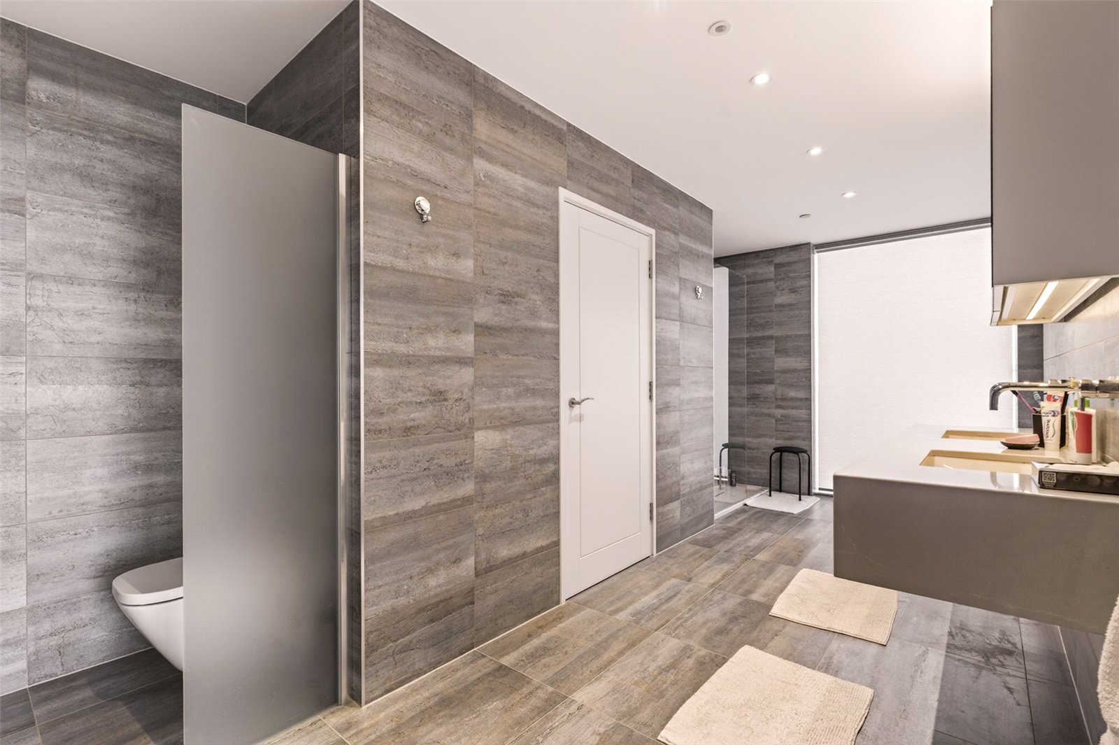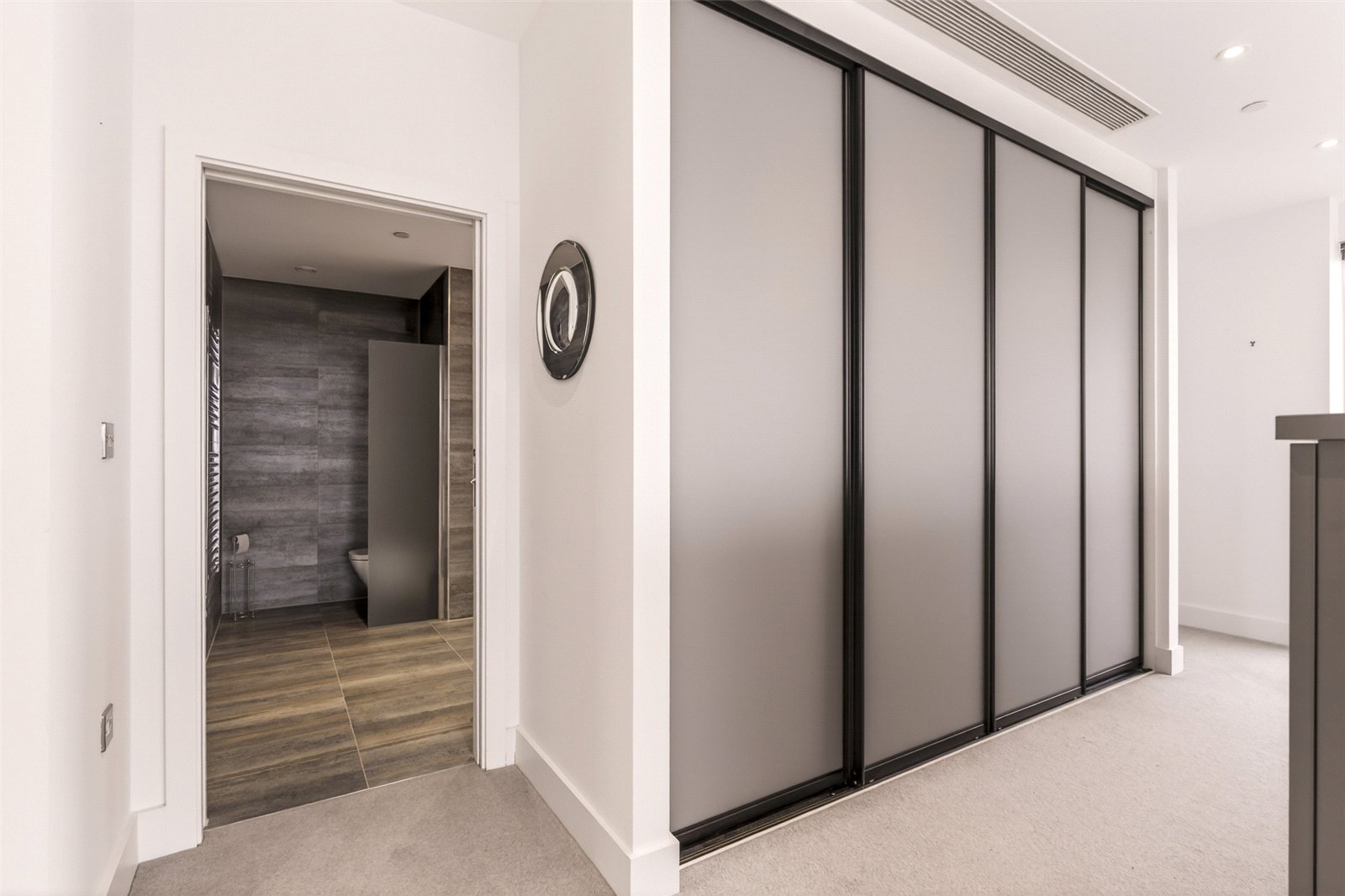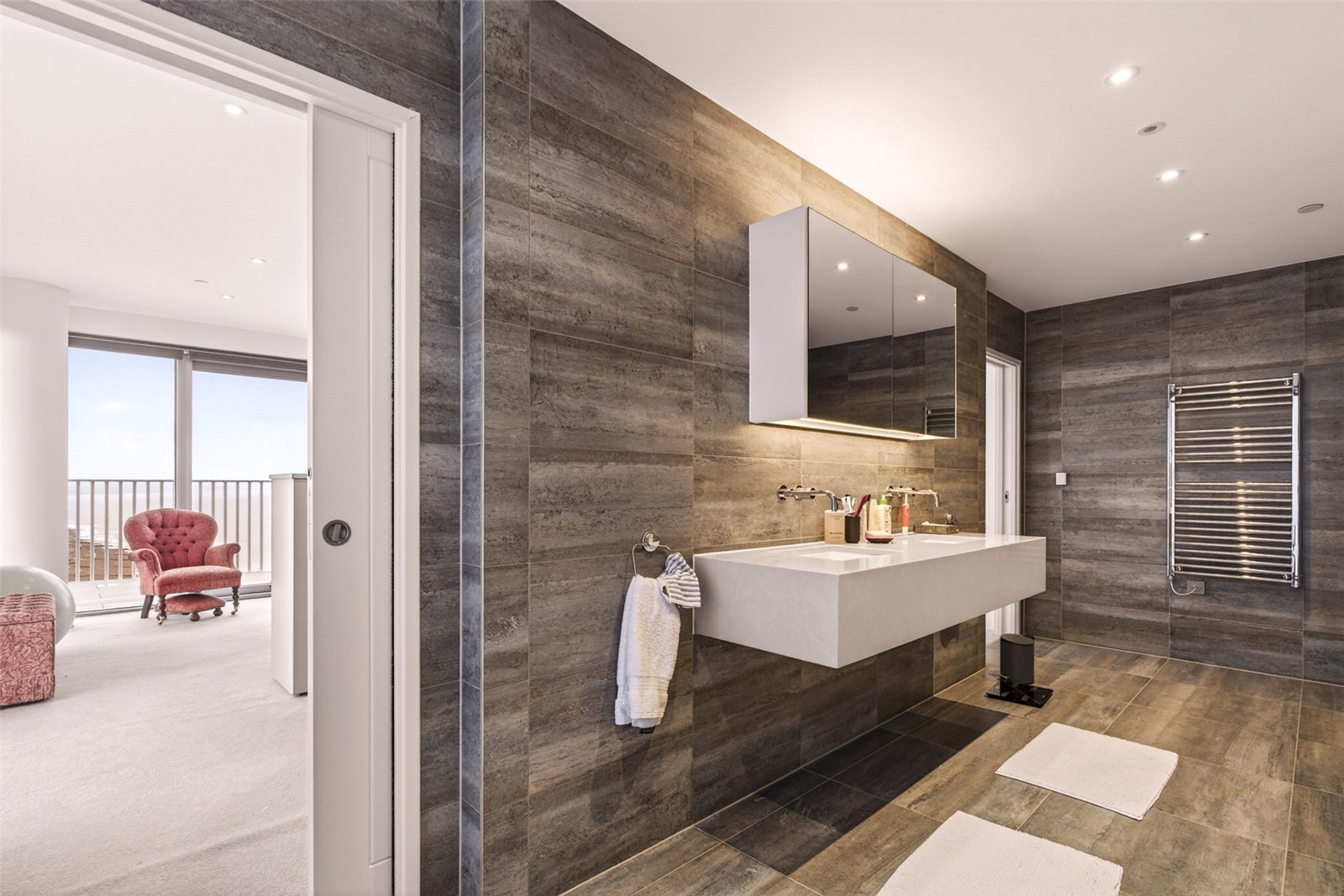 The en suite showcases a walk-in shower, twin wash hand basins, WC, heated towel rail, and discreet storage, all finished to a high contemporary standard.