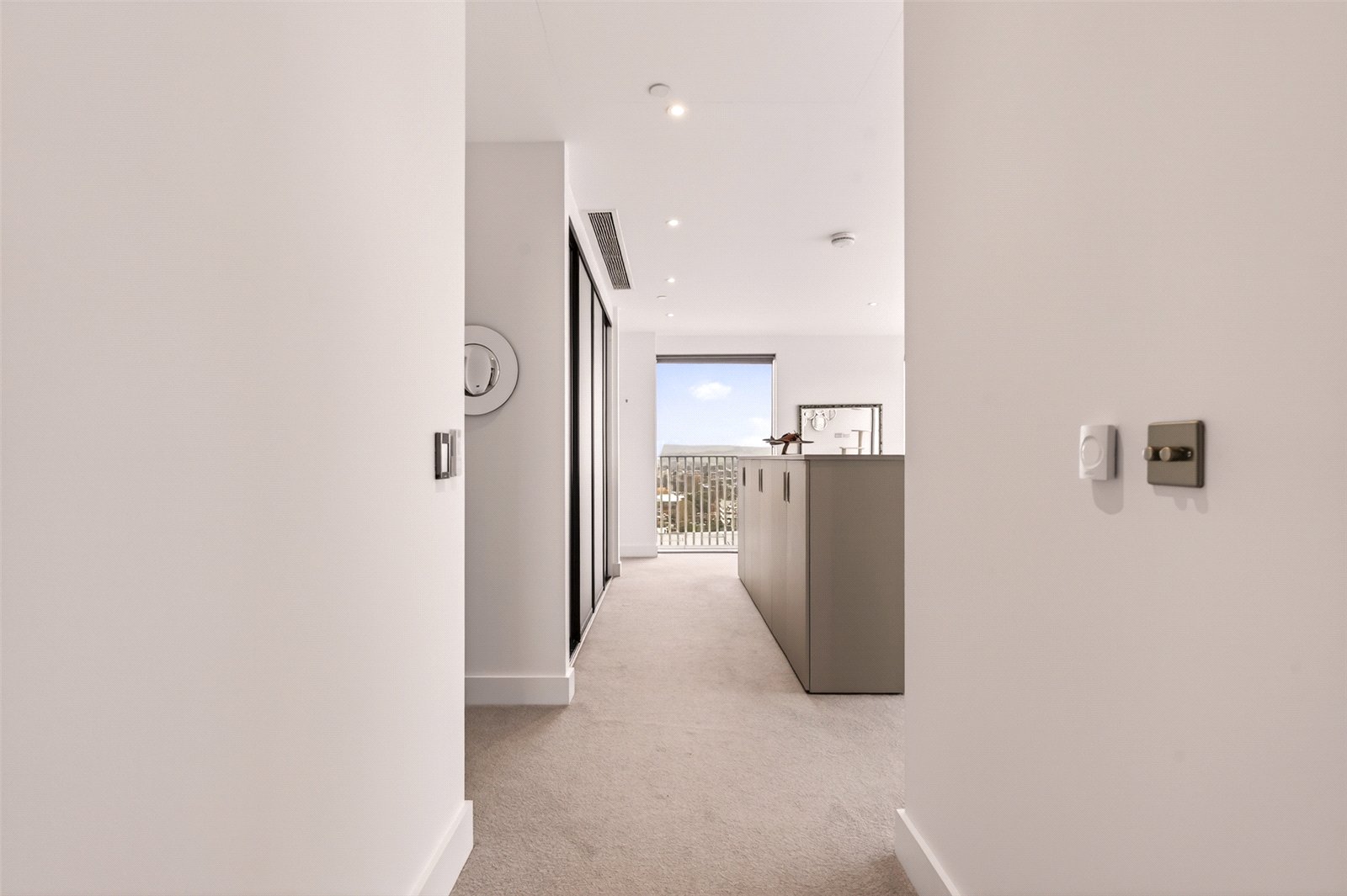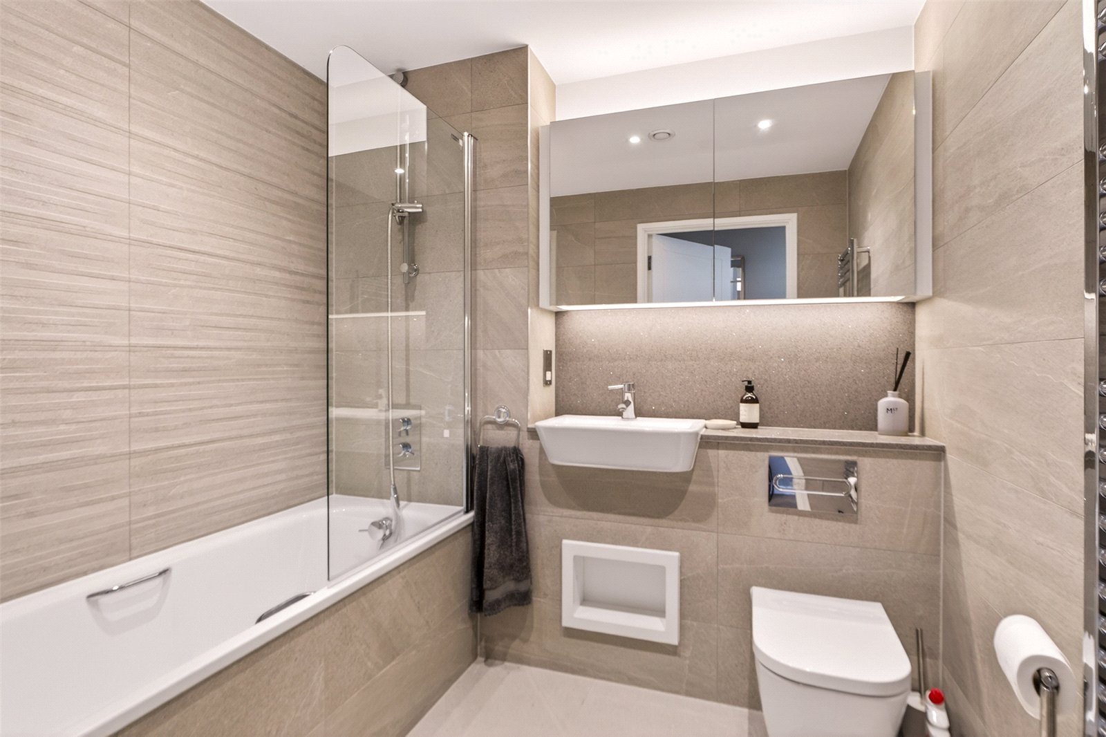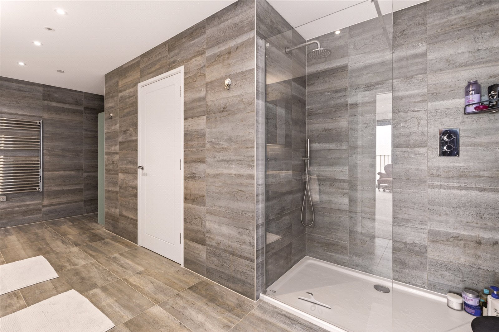 The en suite showcases a walk-in shower, twin wash hand basins, WC, heated towel rail, and discreet storage, all finished to a high contemporary standard.