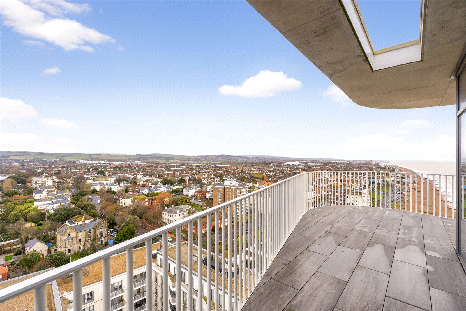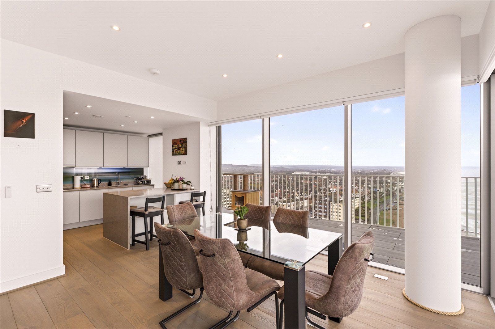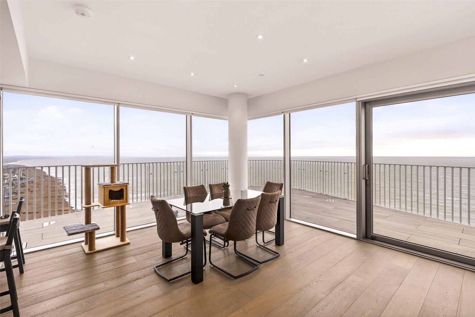 Externally, the penthouse truly excels with a wrap-around balcony offering sweeping views towards Brighton and out across the English Channel—an exceptional space for outdoor dining, entertaining, or simply enjoying coastal sunsets.