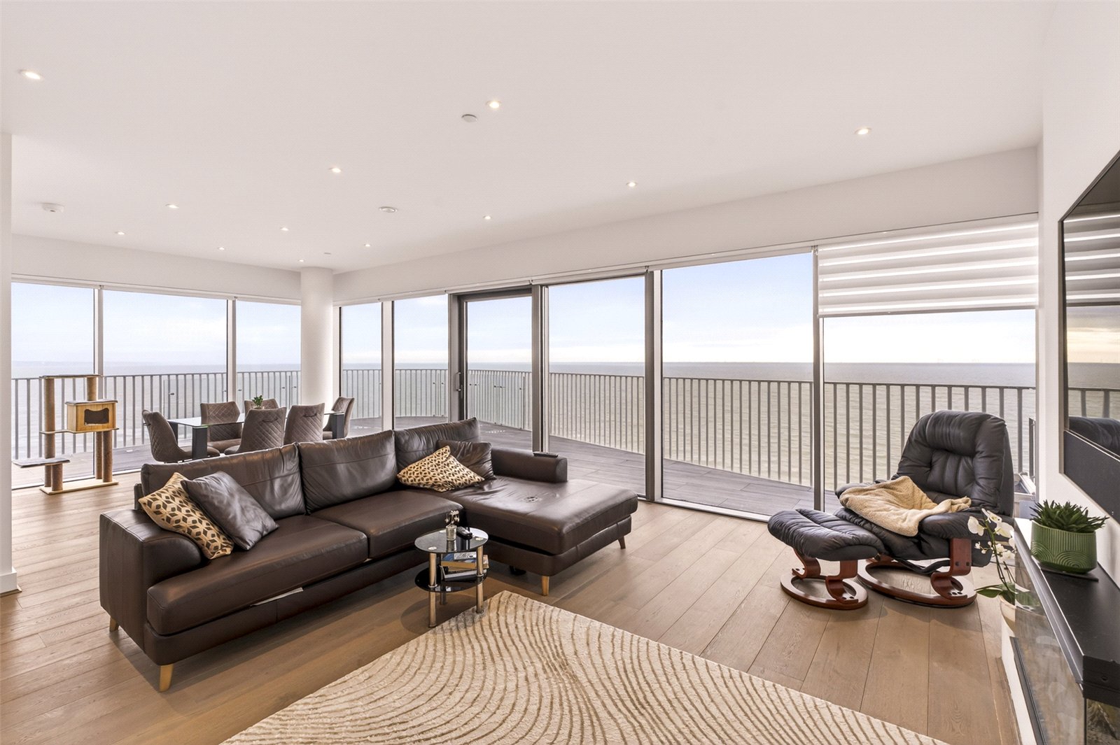 Upon entering the property, a welcoming hallway finished with elegant wood-effect flooring, draws you effortlessly through to the spectacular main living space. Here, expansive glazed frames boast uninterrupted sea views across the English Channel, creating a calming backdrop to everyday living. The living area is impressively proportioned, offering generous space for luxurious seating and a full dining arrangement—ideal for entertaining or simply relaxing while soaking in the ever-changing coastal panorama.