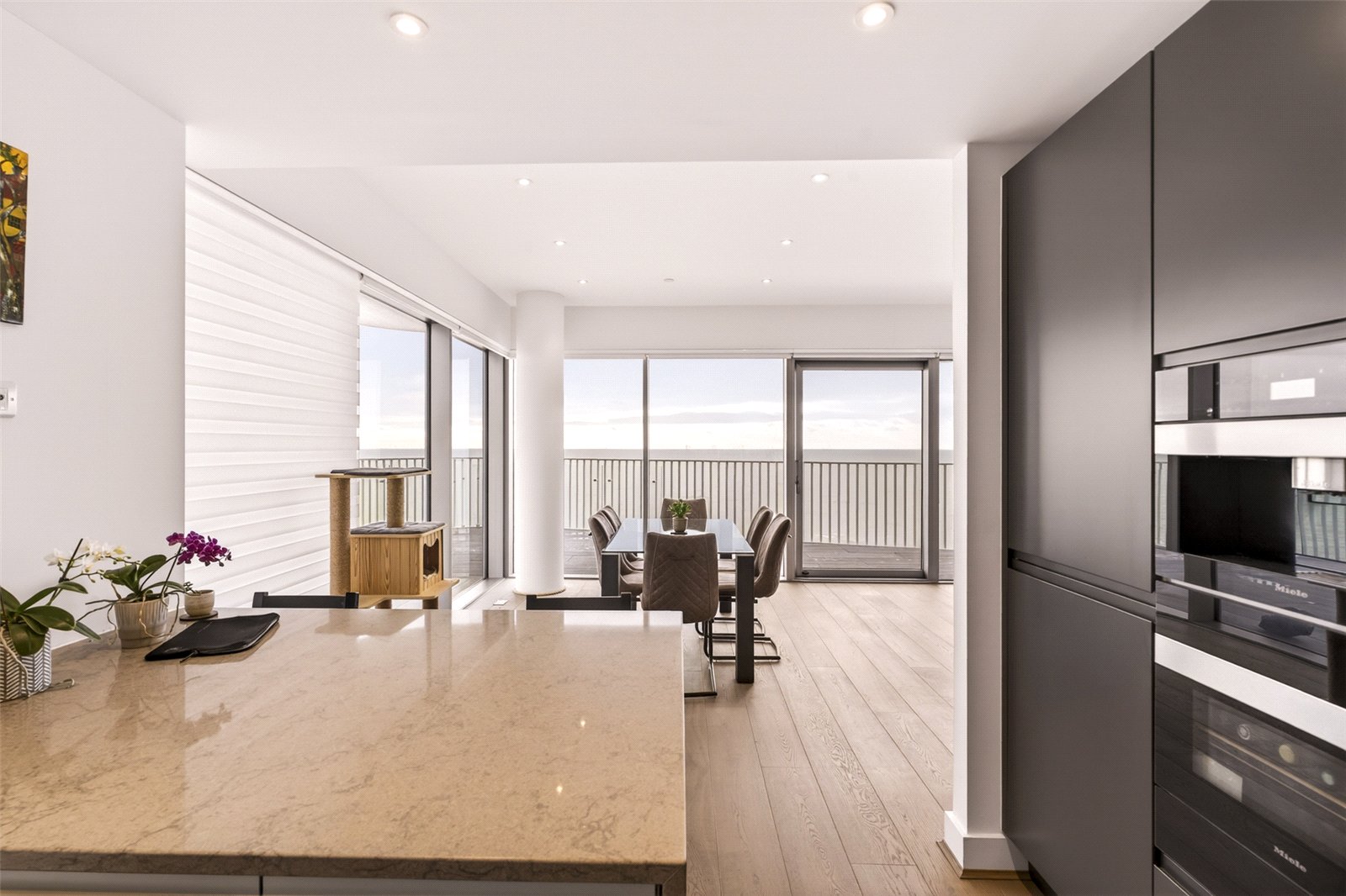 The contemporary kitchen is both stylish and functional, featuring a sleek range of base and wall units, an island, and an array of integrated Miele appliances, providing a refined environment for both casual cooking and gourmet hosting.